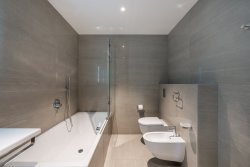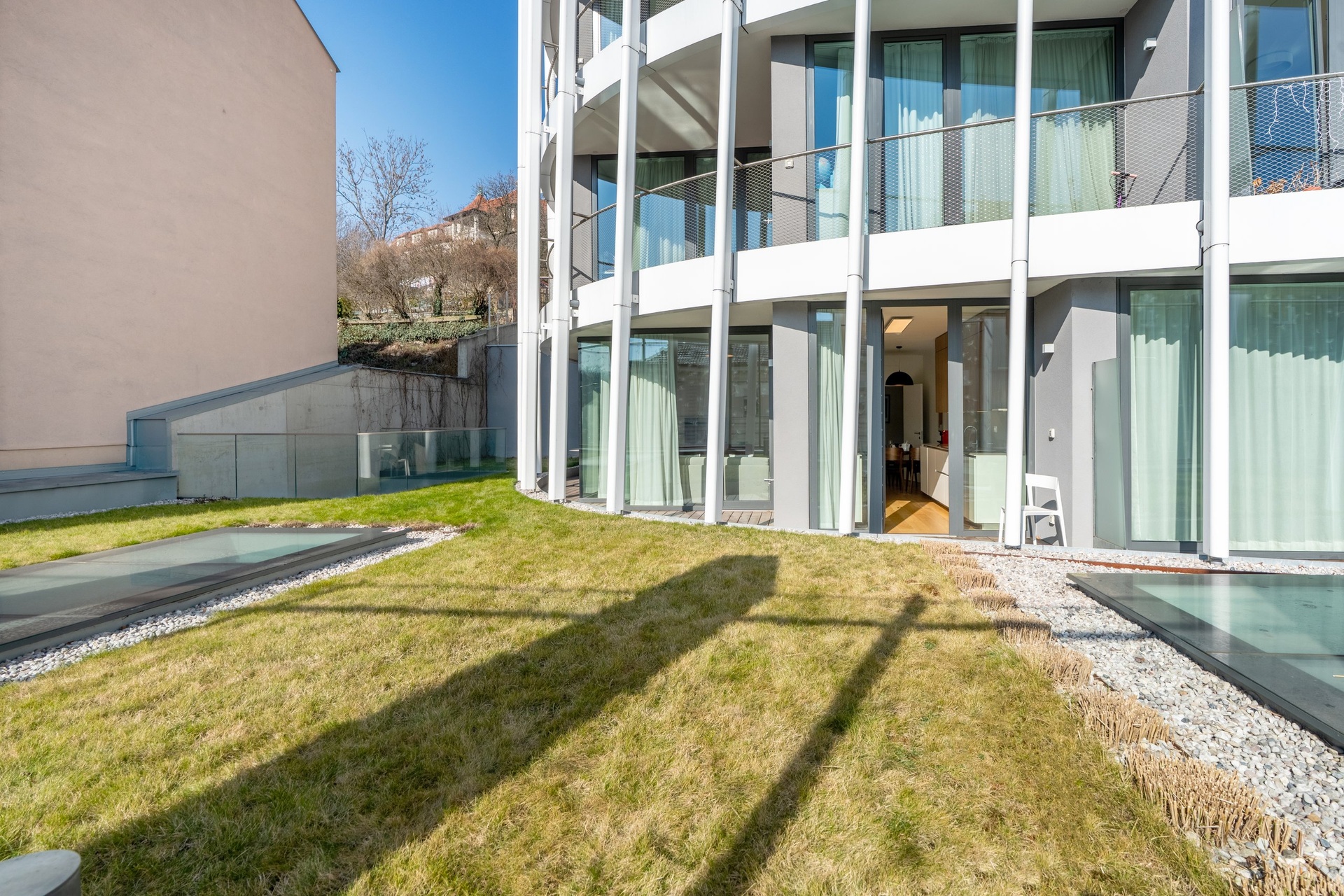High-quality materials were used in the project. Solid wood floors. Large-format tiles in the bathrooms. Underfloor heating throughout the apartment. French windows with sound insulation ensuring peace and quiet as well as excessive lighting. Each room has its own access to the terrace and adjacent garden.
