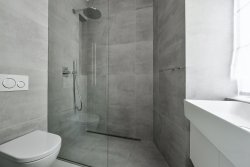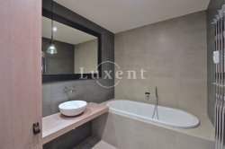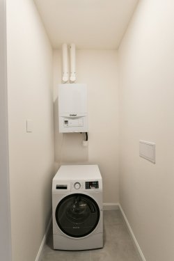 The layout offers an entrance hall, a bathroom with shower, toilet and bidet, a master bedroom with en suite bathroom with shower and toilet, one more bedroom and a spacious living room with a kitchenette equipped with all appliances - induction hob, hood, hot air oven, dishwasher and fridge with freezer. The equipment also includes a washing machine with dryer.