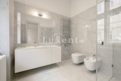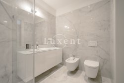 The spacious interior of the apartment offers a representative living area with a fully equipped designer kitchen, a dining space, and access to both balconies. There are also three comfortable bedrooms with en-suite bathrooms (two with a shower, bidet, and toilet, and the third with a shower and toilet), a separate guest toilet, a utility room, an entrance hall, and a corridor with built-in wardrobes.