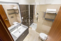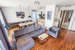 The apartment has two bedrooms, a study and a spacious living room with kitchenette. There are also two bathrooms with shower and bath, and a separate dressing room. It is fully equipped with all appliances, dishes and plenty of storage space. The bathroom has a shower, washer and dryer. Floor heating in the bathroom contributes to a feeling of perfect comfort.
