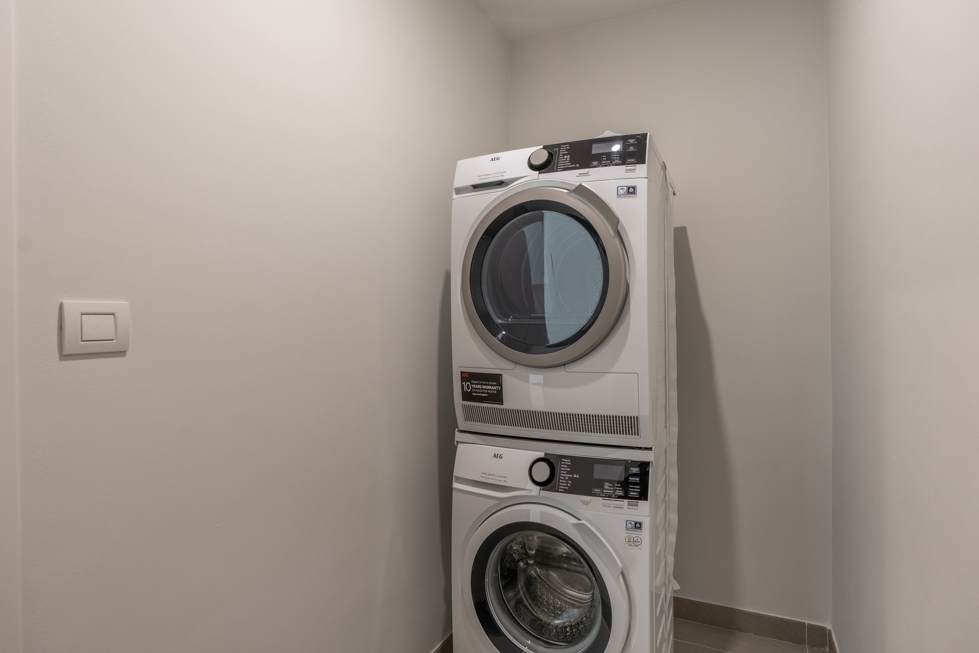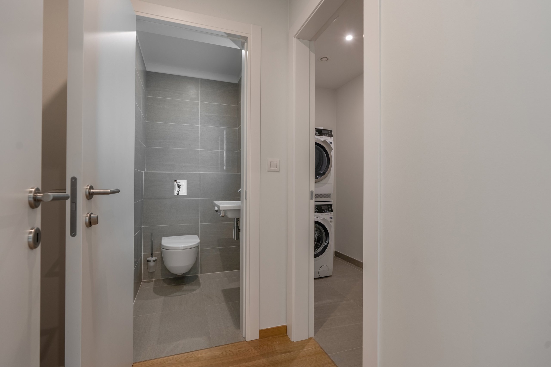 The layout includes a spacious and bright living room, a modern kitchenette with all appliances, three bedrooms, one with its own bathroom, a second bathroom with a bathtub, shower, toilet, and bidet, a hallway, a separate utility room with a washer and dryer and a guest toilet.