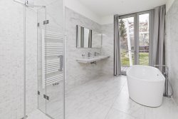 High-quality materials were used in the project. Solid wood floors. Large-format tiles in the bathrooms. Underfloor heating throughout the apartment. French windows with sound insulation ensuring peace and quiet as well as excessive lighting. Each room has its own access to the terrace with a view.
