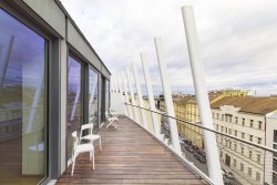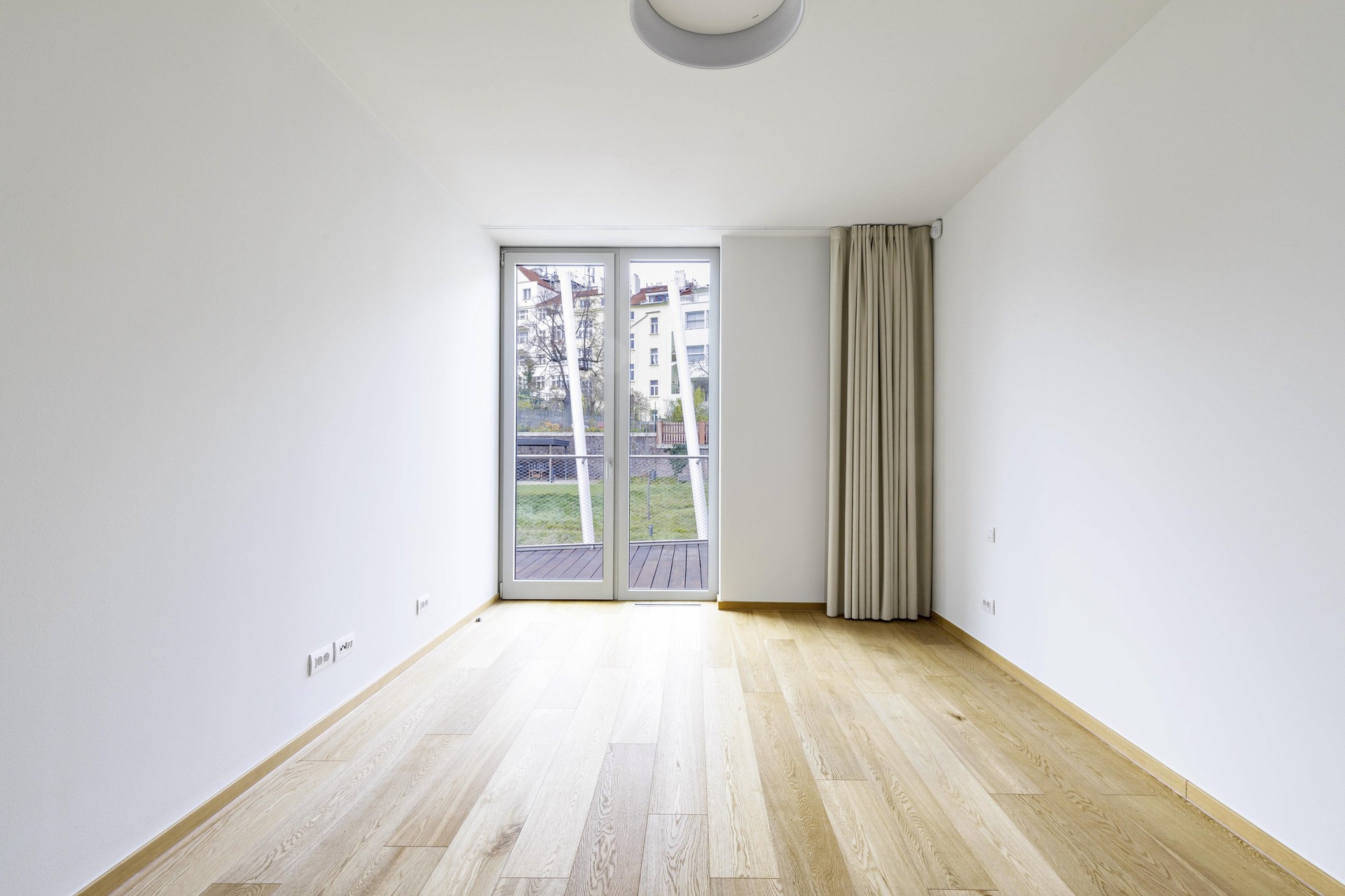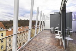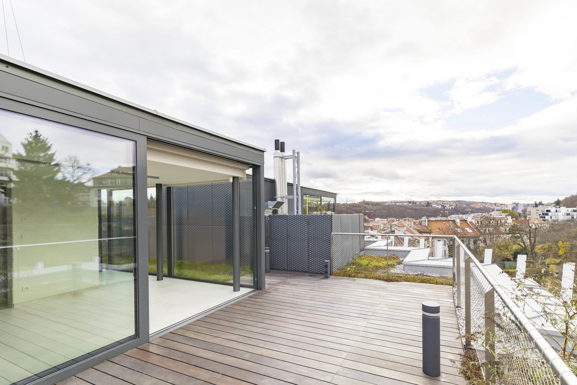We offer for rent a spacious 4+kk duplex penthouse with a usable area of 212 sqm with three terraces on the 6th and 7th floors of a new residential project with an elevator and a number of above-standard additional services such as a reception, swimming pool, wellness center, and a large shared garden in an enclosed courtyard. The apartment comes with a cellar, and a parking space in the underground garage can be rented for an additional fee.