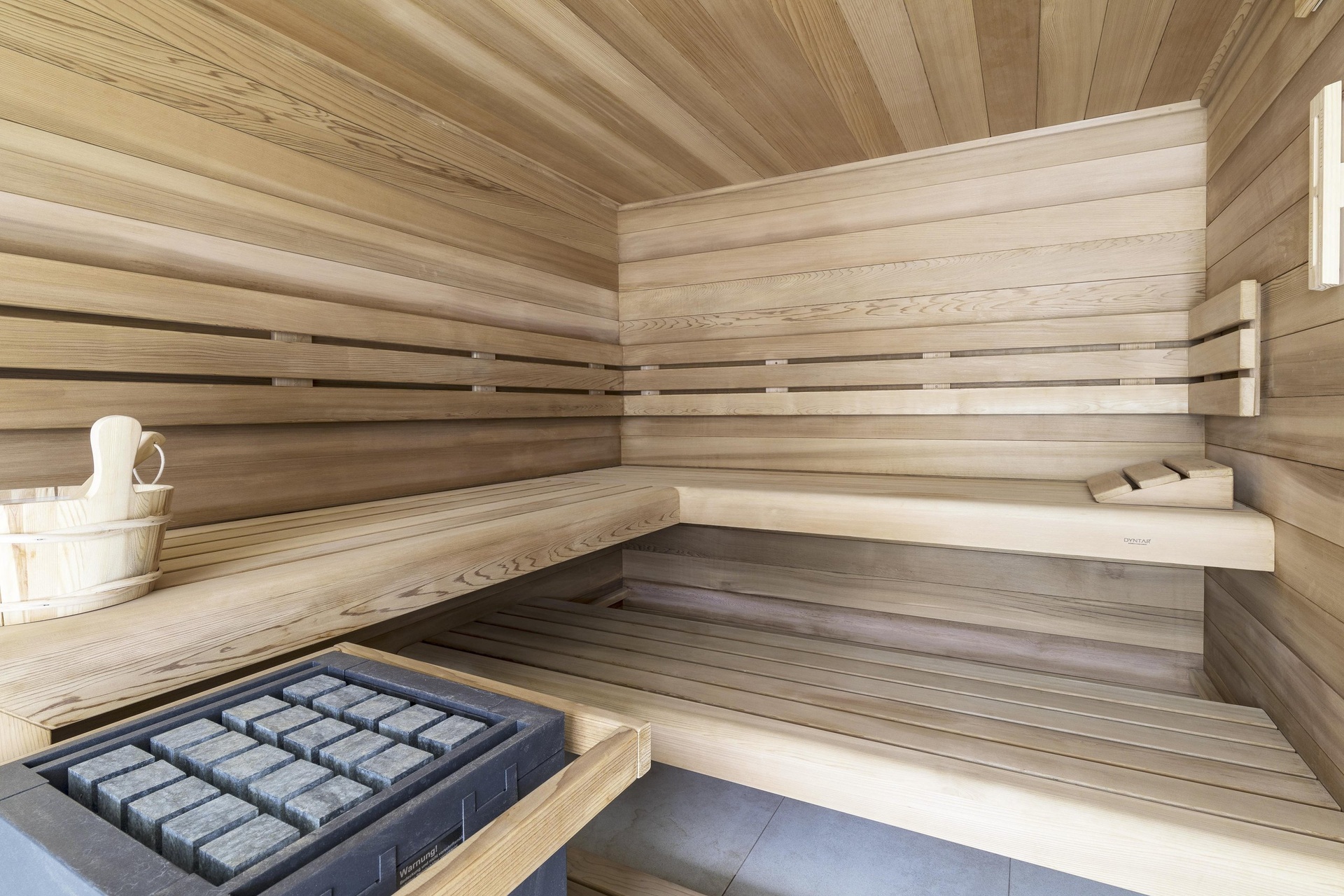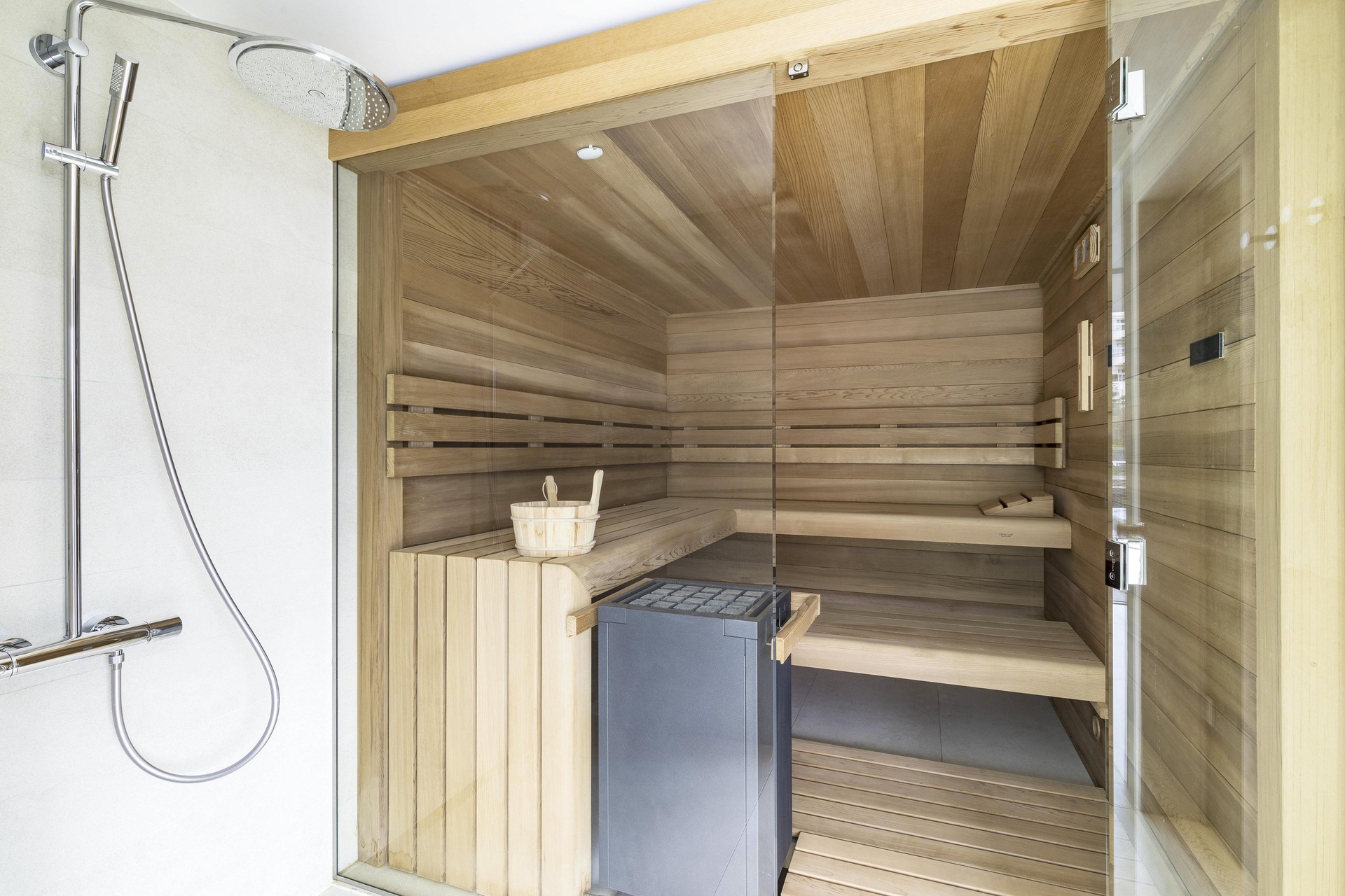 On the upper floor of the duplex there is a private sauna with a separate shower and toilet, a terrace with panoramic views of the surrounding area and a garden.