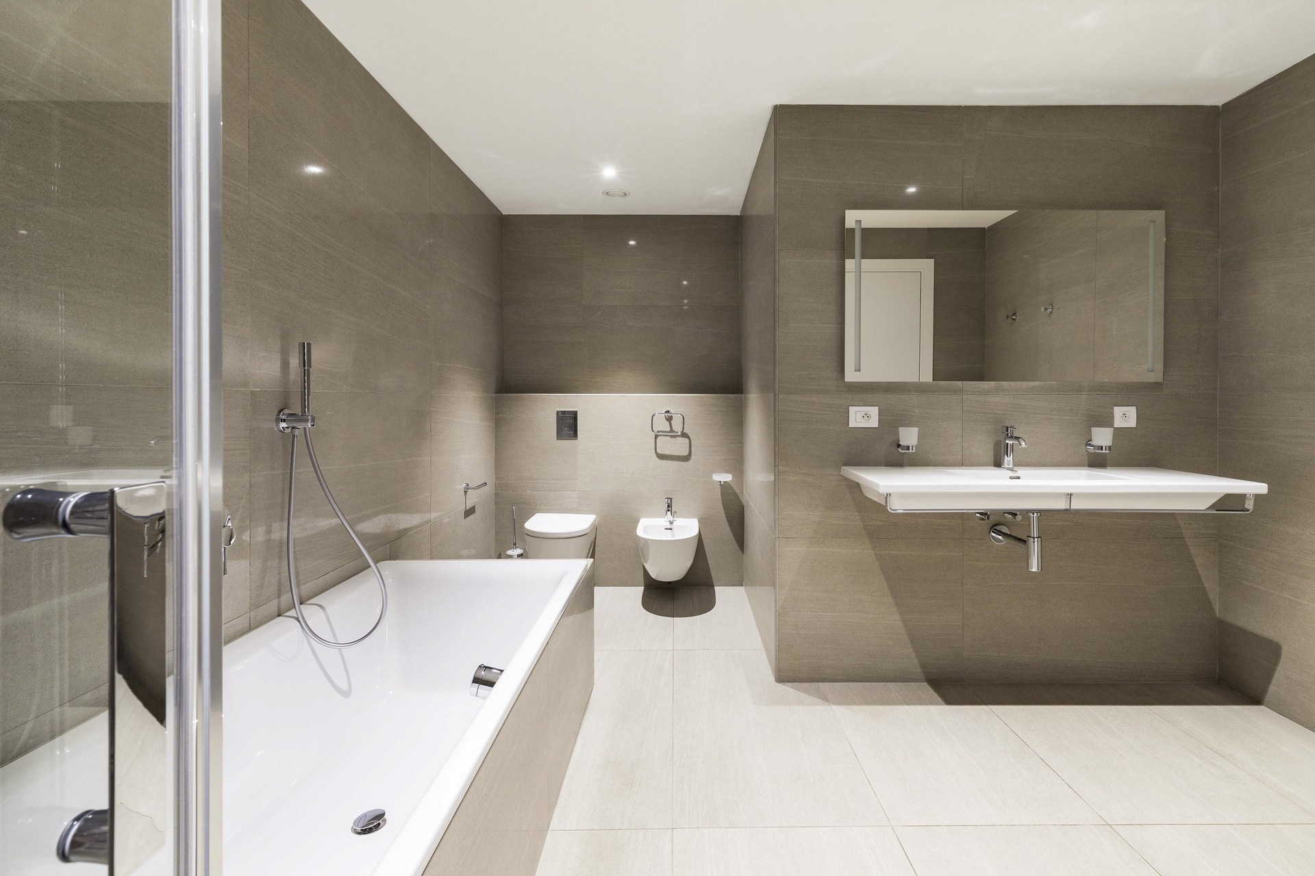 The layout includes a spacious and bright living room on the ground floor, a modern kitchenette equipped with all appliances, three bedrooms, one of which has a walk-in closet and its own bathroom with a bathtub, shower, toilet, and bidet, a separate bathroom with a bathtub, shower, toilet, and bidet, a hallway, a separate toilet, and a utility room. All rooms have access to terraces that follow the floor plan of the apartment.