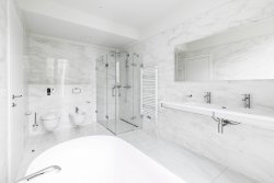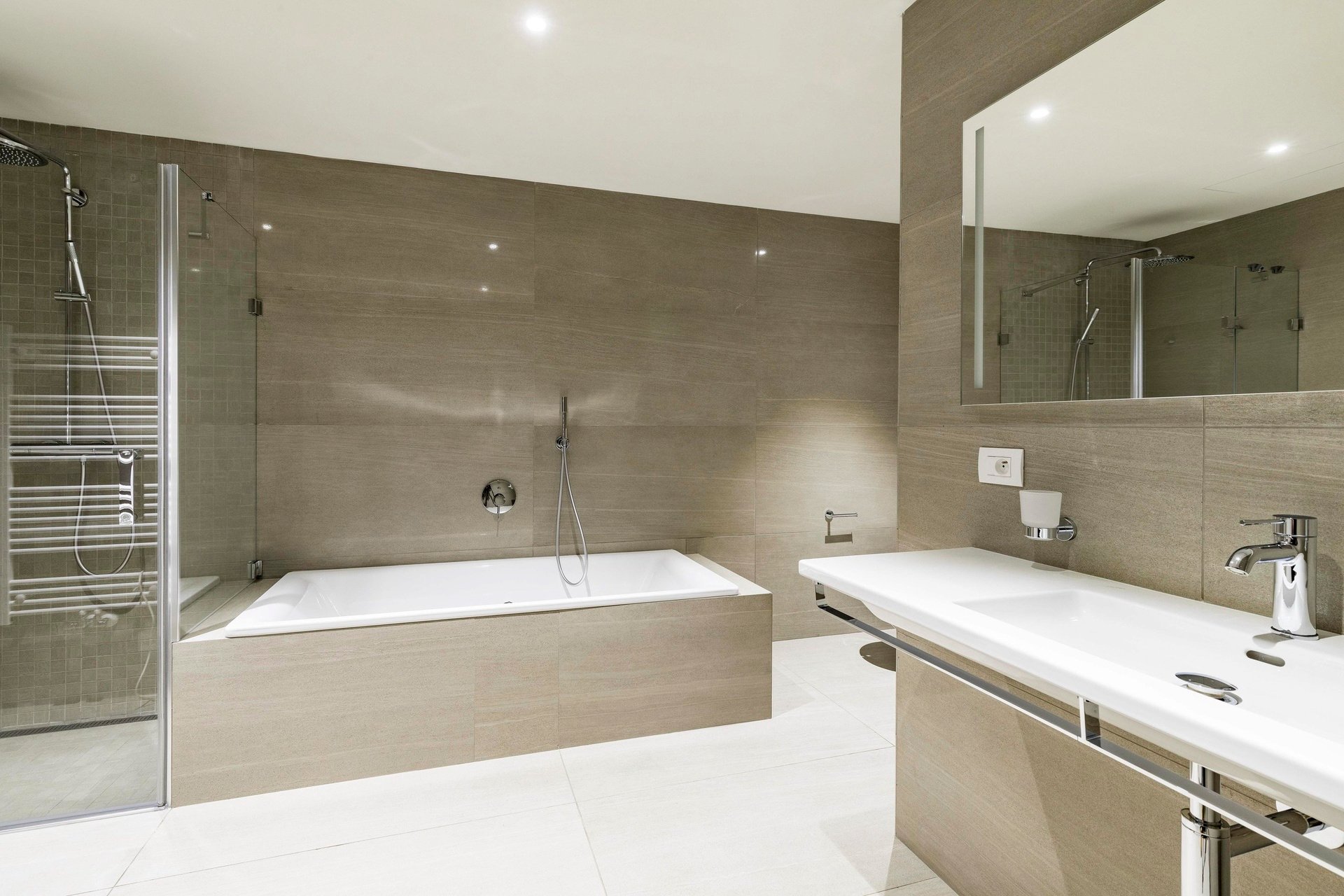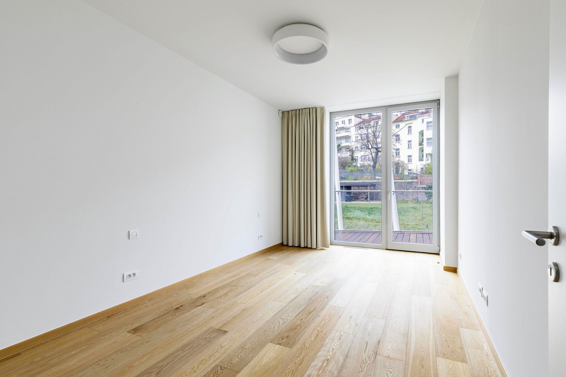 High-quality materials were used in the project. Solid wood floors. Large-format tiles in the bathrooms. Underfloor heating throughout the apartment. French windows with sound insulation ensuring peace and quiet as well as excessive lighting. Each room has its own access to the terrace with a view.