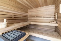 On the upper floor of the duplex there is a private sauna with a separate shower and toilet, a terrace with panoramic views of the surrounding area and a garden.