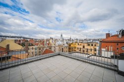 The space is thoughtfully divided across two floors and includes three separate office units, two bathrooms (one on each floor), a kitchenette on the ground floor, and a terrace on the upper floor offering breathtaking views of Prague’s skyline, including Prague Castle and Petřín Hill. The terrace provides the perfect setting for relaxation, informal meetings, or small company events during nice weather.