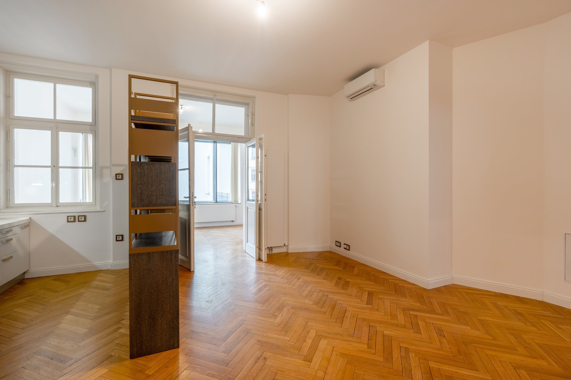 The space consists of an entrance hall, three separate offices/living rooms, a fully equipped kitchen with a dining area, two separate bathrooms, and two smaller balconies overlooking Jáchymova Street and a quiet courtyard. Thanks to two separate bathrooms, it offers maximum comfort, flexibility, and privacy—an ideal solution especially for teams with a larger number of employees or for companies that need separate zones.