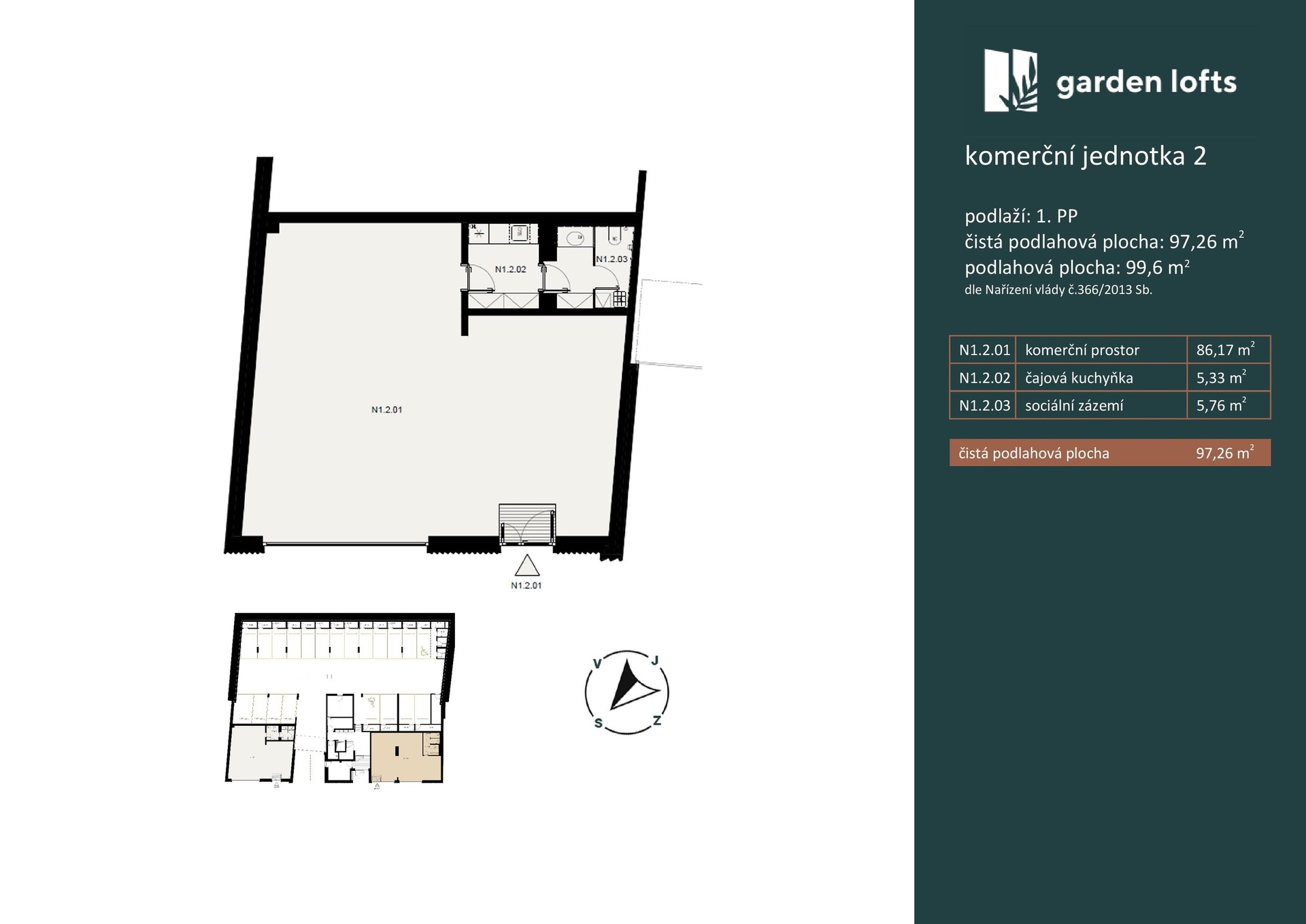 We offer for rent a commercial unit with a floor area of 98.9 sqm on the ground floor of a unique development project Garden Lofts in Pechlátova street, Prague 5.