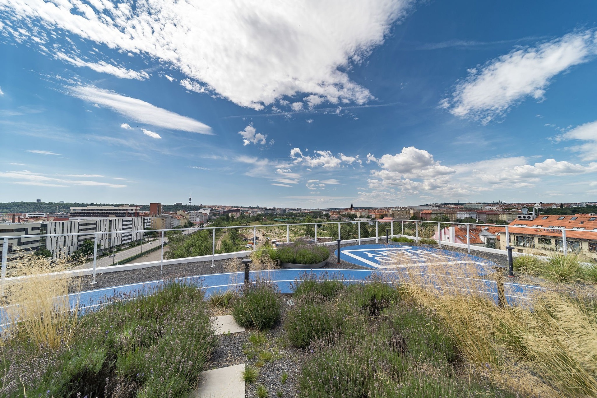 The complex provides ideal conditions not only for work, but also for entertainment and relaxation. The building is the first office building in the Czech Republic with a running track located on the roof and a sports field for active relaxation. A restaurant with a café offers a pleasant environment for lunches or business meetings with clients. There are also terraces providing breathtaking views of the Botanical Gardens, another feature that is sure to impress your visitors.