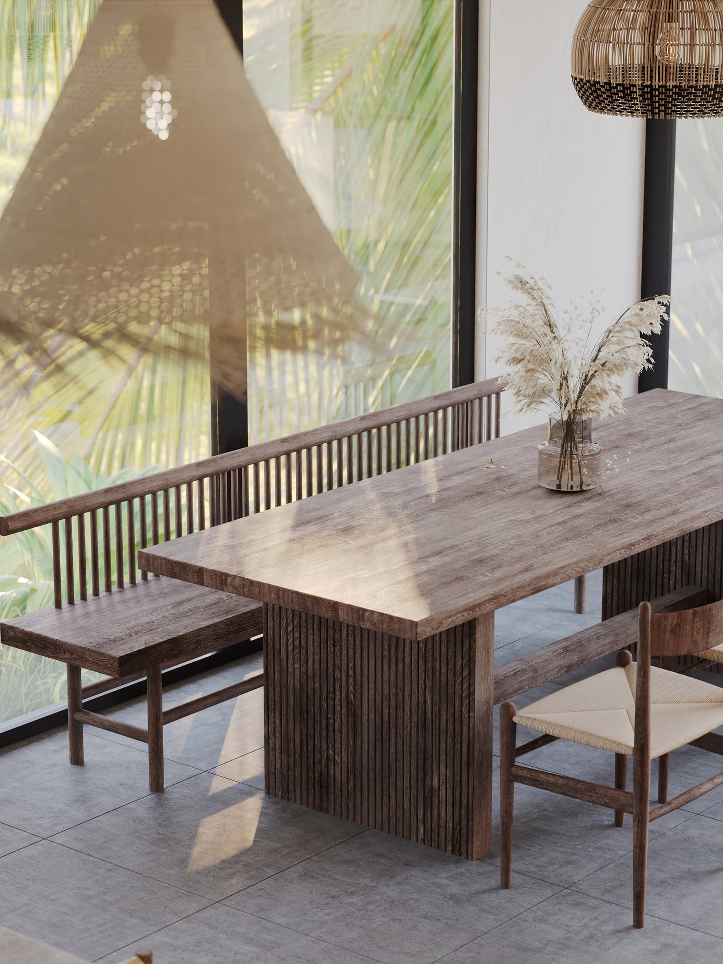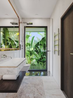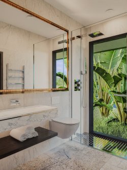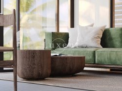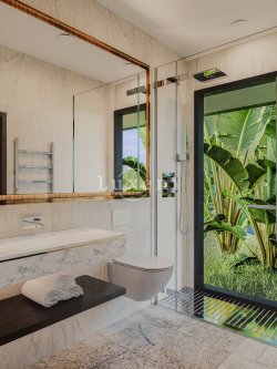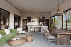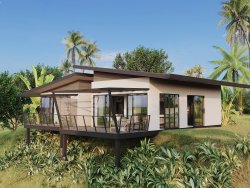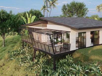 You can choose from houses in three variants - one, two or three bedrooms. The layouts are variable and can be modified as desired. The social living area of the interior is separated by a practical entrance hall from the bedrooms and bathroom. The attractive and functional minimalist design of the houses is complemented by extensive private grounds with spring water, mature trees and a fertile garden where you can harvest your own tropical fruits. In addition to the pleasant atmosphere of the design house, you will therefore also get your own unique rich green privacy. The interior materials are wood and ceramic tiles, but you can choose from many types of superior tropical wood floors.