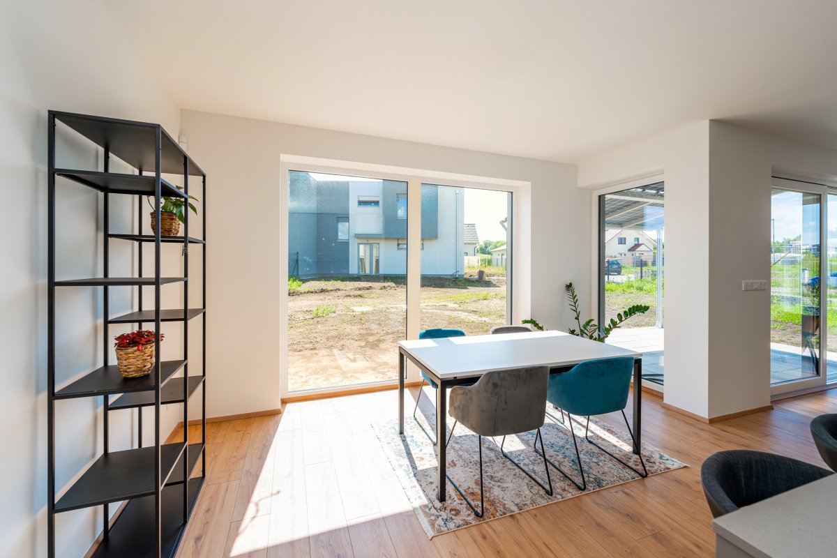 We are currently working on furnishing a model house. A kitchen and pergola with a photovoltaic system has been completed and can be implemented in all houses as part of client changes. All the houses offered have the preparation for photovoltaics built in the standards of the house. The house is also fitted with furniture to illustrate the interior design possibilities.