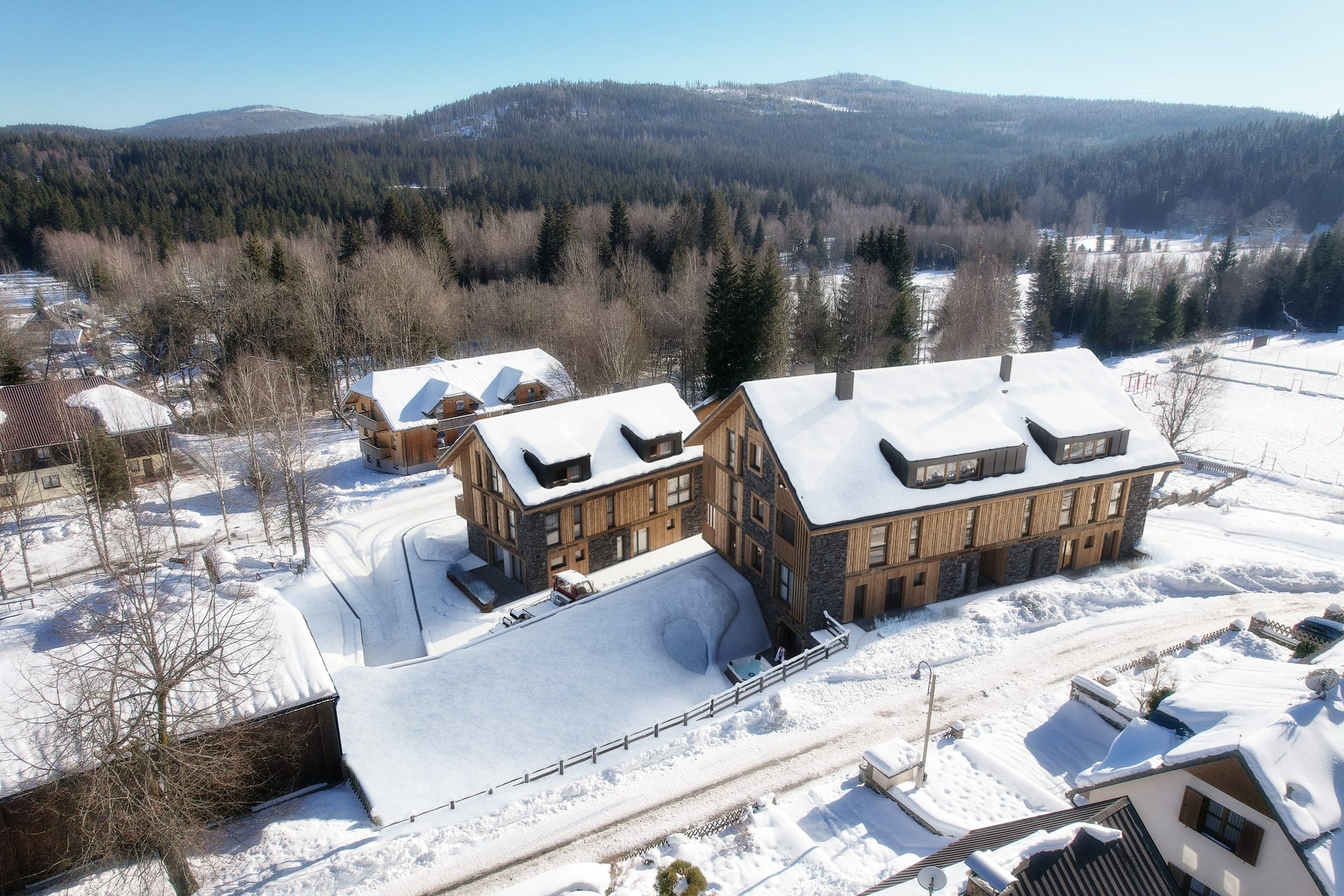 The chamber hot residence LAKA LIVING is being built in the heart of the Sumava National Park, in the picturesque village of Prášily. The property is located on the site of a former border company building and comprises a total of 20 luxury apartments with a layout of 1 + kk, 2 + kk and 3 + kk and unit sizes from 24.7 m² to 92.7 m² in two apartment buildings. The architecture of the project is fully in line with the local development and the location of the national park. Bright rooms with magnificent views of the mountain landscape are accentuated by the quality natural materials throughout the property.