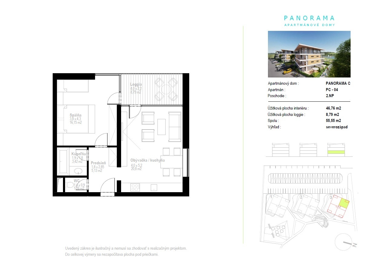 We offer for sale apartment 2+kt in new residence Marina Liptov located in the surroundings of majestic mountains, picturesque national parks and the longest Slovak dam Liptovská Mara. The apartment is located on the 1st floor and has a living area of 47 sqm and a total usable area of 56 sqm. The layout of the apartment offers a living room with kitchenette, bedroom and bathroom, the apartment also has a loggia of 8.8 sqm accessible from the living room and bedroom. The house has wheelchair access and a lift, each apartment has a parking space and a cellar, which are already included in the price.