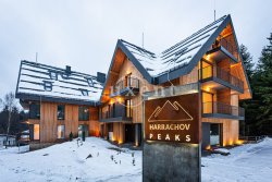 Harrachov Peaks is a luxury project built from quality natural materials with a wellness with sauna and whirlpool and fully equipped fitness. It presents only 16 modern apartments and thus offers an intimate atmosphere in the house for their owners.  Its concept will satisfy those interested in second homes in the Giant Mountains as well as investors with the intention of securing their finances or practicing profitable short-term rentals. The offer also includes apartment management including rentals. The HARRACHOV PEAKS project offers a high standard of furnishings - oak floors, wooden terraces, large format tiles in bathrooms and corridors and more. Heating is provided by heat pumps and is distributed by underfloor heating system. The apartment has heat recovery. The energy class is very economical B.