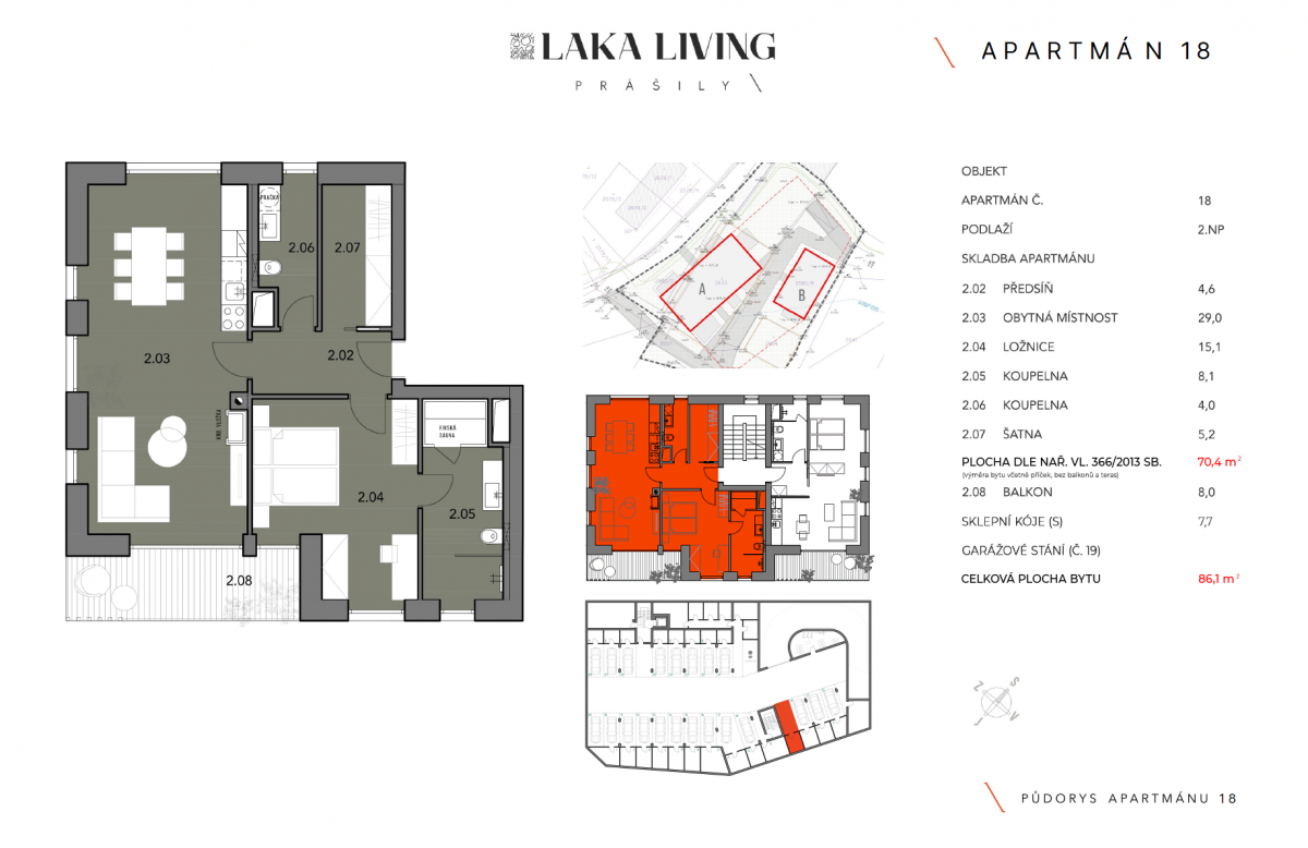 We offer for sale a luxury mountain apartment of 2 + kk with a living area of 66 m² and a floor area of 70.4 m² with a balcony of 8 m². The apartment is located on the 2nd floor of the apartment building "B" in the newly emerging development project LAKA LIVING in Sumava. The apartment is oriented on the SE-SE-NW side. The apartment consists of a living room (29 m²), a bedroom (15.1 m²) with its own bathroom including a Finnish sauna and toilet (8.1 m²), a dressing room (5.2 m²), a second bathroom with toilet (4 m²) and a hallway (4.6 m²).