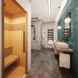 The apartment has a wooden fireproof entrance door, interior frameless doors, wooden windows with triple glazing and outdoor electric blinds Climax. The heated three-layer floating floor is made of solid brushed oak. The underfloor heating will be controlled remotely. Included in the price of the apartments is a fully equipped kitchen including appliances and a fully fitted bathroom. Tiles and tiles are from the Spanish company Pamesa, the kitchen with granite sink and taps from Franke is complete with appliances from Elektrolux (fridge, dishwasher, oven, induction hob, extractor hood). Linear ceiling lights are built in the bathroom and hallway. The price includes a fireplace insert and a Finnish sauna in the larger of the bathrooms.