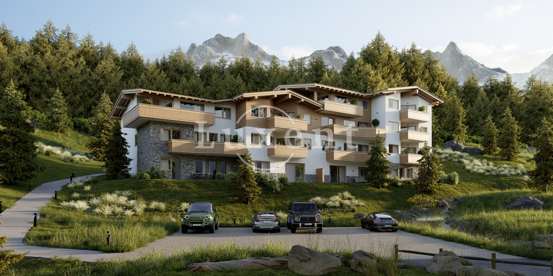 Each unit offers living spaces ranging from 60 m² to 120 m² and meets the highest standards of comfort and design. You can choose from options with one to three bedrooms, each with en-suite bathrooms, and some apartments also feature a private sauna or wellness bathroom. All units are designed with a focus on quality, functionality, and seamless integration with the surrounding nature. Spacious balconies or terraces with panoramic mountain views are a standard feature.