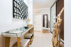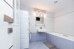 The apartment includes a parking space in the underground garage and a cellar. The layout includes a living room with a sofa bed, a kitchenette equipped with all appliances, a bedroom with a double bed, a bathroom with a bathtub and sink, and a separate toilet. The apartment is sold fully furnished to a high standard. Built-in storage space. High-quality Quantum bed. Terrace with outdoor seating and barbecue. The bathroom includes a washing machine and dryer.