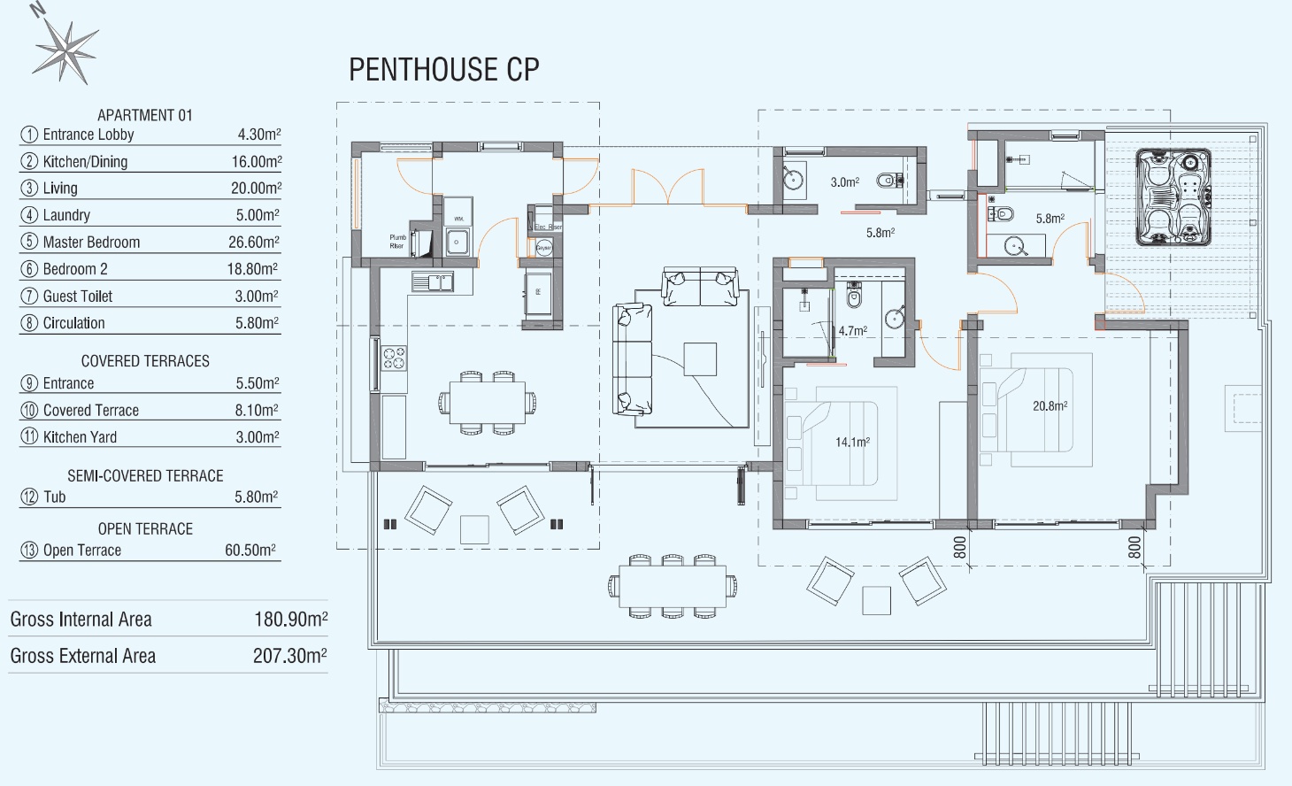 he layout of the apartment with a living area of 100 m² includes two bedrooms with en-suite bathrooms (27 m² and 19 m²) and terraces. The spacious living room (20 sqm) with kitchen and dining room (16 sqm) has large bay windows through which you can access additional terraces (74 sqm in total), which are partly covered. The apartment also includes, laundry room (5 m²), guest toilet (3 m²), kitchen courtyard (3 m²), hallway (6 m²) and entrance hall (4 m²). This apartment also includes two parking spaces.
