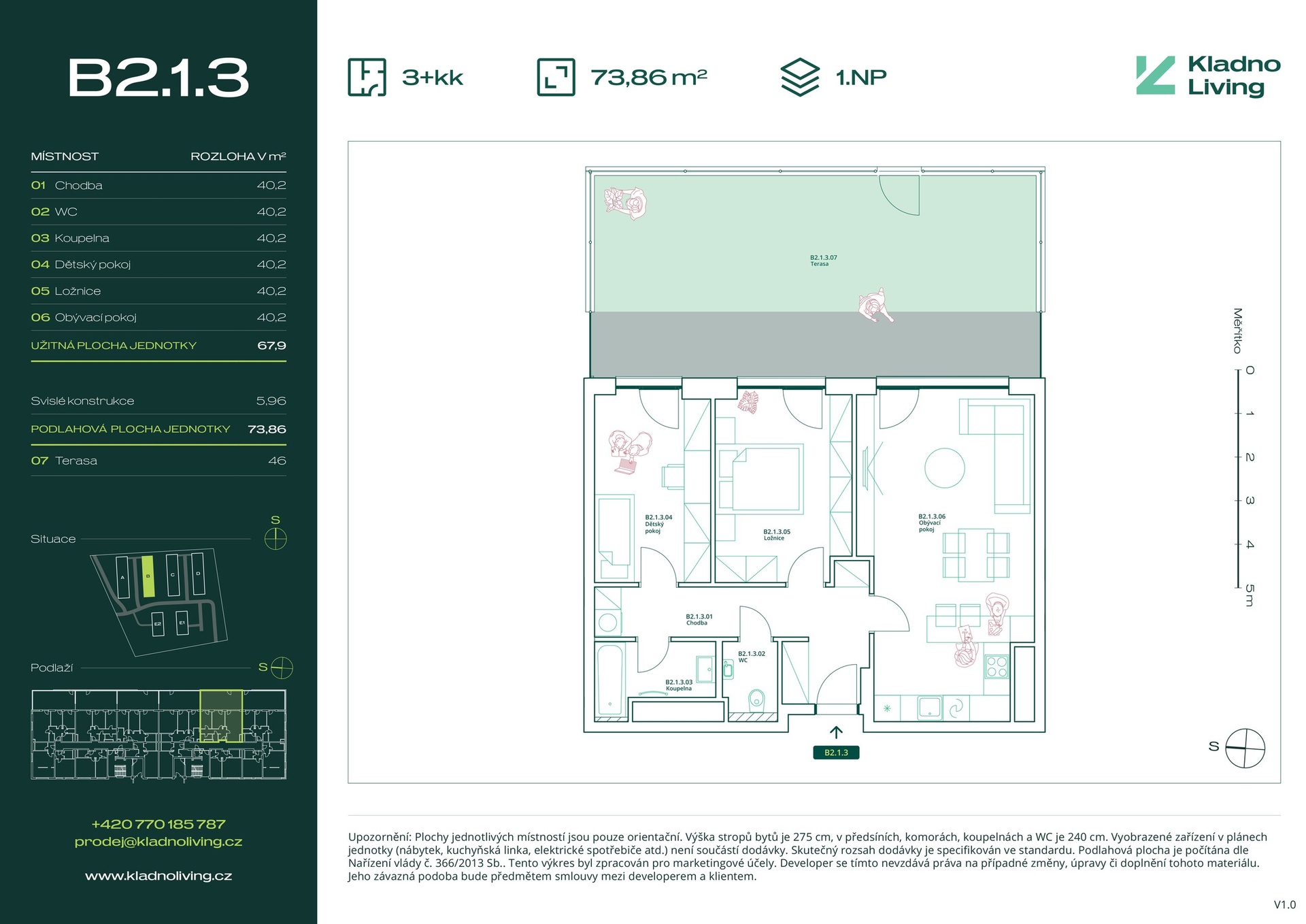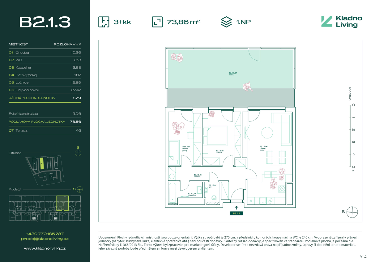 We are offering for sale a modern apartment 3+kt with a floor area of 73,9 sqm and a terrace of 46 sqm in the Kladno Living residential project, which is being built in one of the most attractive locations in the city of Kladno – Kročehlavy. This new development project represents a unique opportunity for those looking for new apartments in Kladno or an investment in real estate with high appreciation potential.