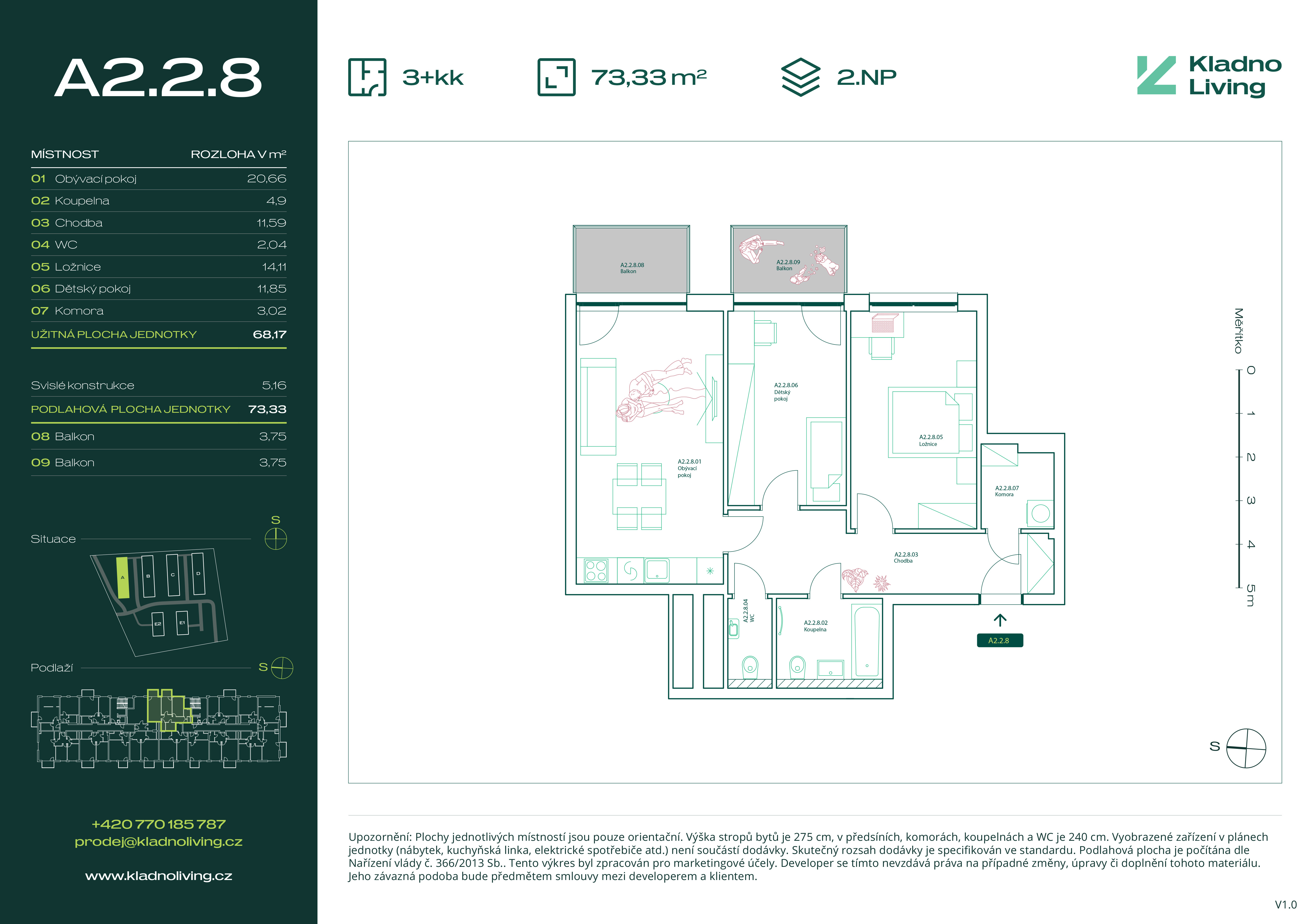We are offering for sale a modern apartment 3+kt with a floor area of 73,3 sqm and two balconies measuring 3.75 and 3.75 sqm in the Kladno Living residential project, which is being built in one of the most attractive locations in the city of Kladno – Kročehlavy. This new development project represents a unique opportunity for those looking for new apartments in Kladno or an investment in real estate with high appreciation potential.