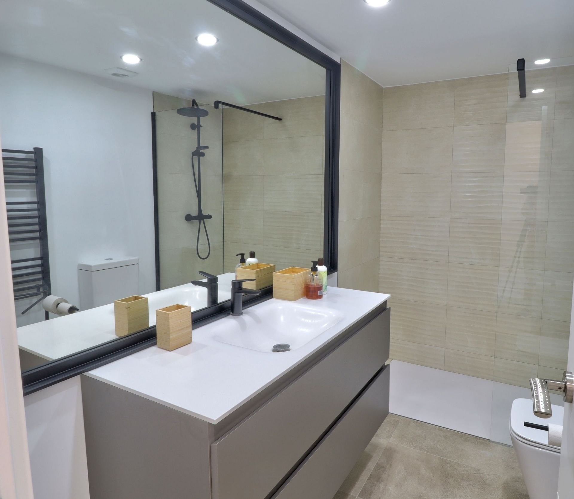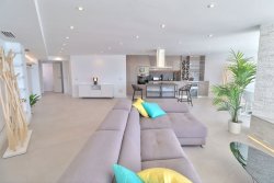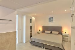 The larger two bedroom apartment consists of a spacious open plan living room with dining area and fully equipped kitchen and a 15 sqm balcony from which you can enjoy views of the sandy beach and the waves of the Mediterranean Sea. The apartment has two spacious bedrooms with en-suite bathrooms, one of which is equipped with a sauna. Air conditioning is a matter of course here. The apartments also have a parking space in the underground garage.