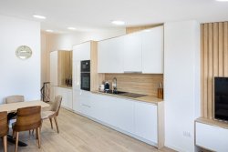 The property is fully furnished with custom-made furniture and features the use of top-quality materials and technologies. Amenities include underfloor heating and air conditioning connected to a hydrobox system (Samsung heat pump, including heating, water heating, and air conditioning).