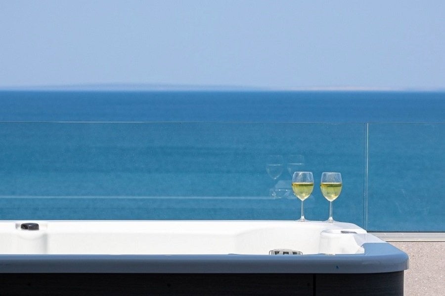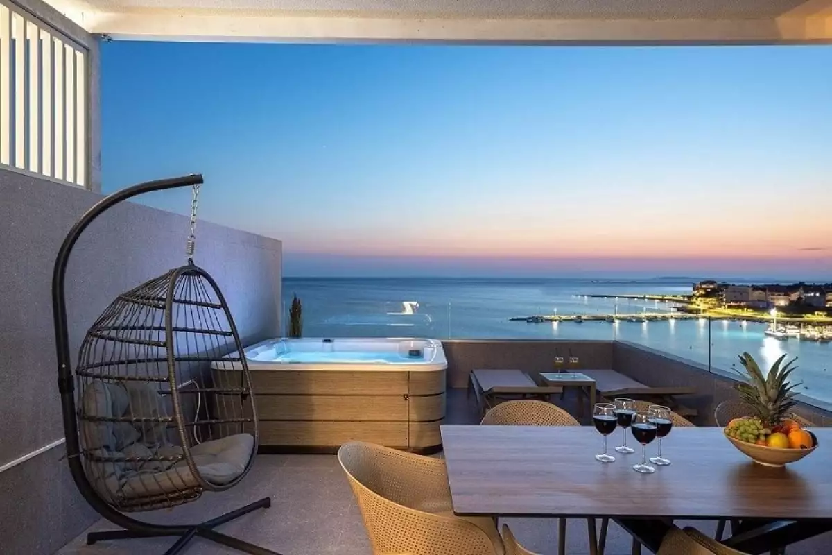 The second floor offers an airy gallery converted into a spacious living room with direct access to a terrace equipped with a private hot tub, ideal for relaxing while watching the sun set over the Adriatic Sea.