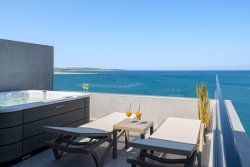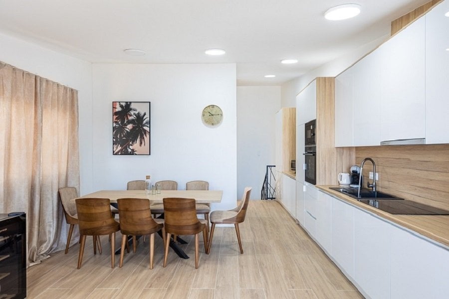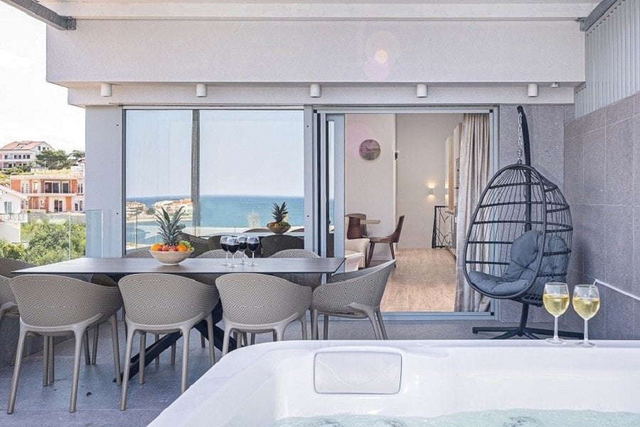 The apartment is spread over the second and third floors of the building. On the first level, there are two spacious bedrooms, two modern bathrooms, and two balconies from which you can enjoy the fresh sea air and stunning panoramic views.