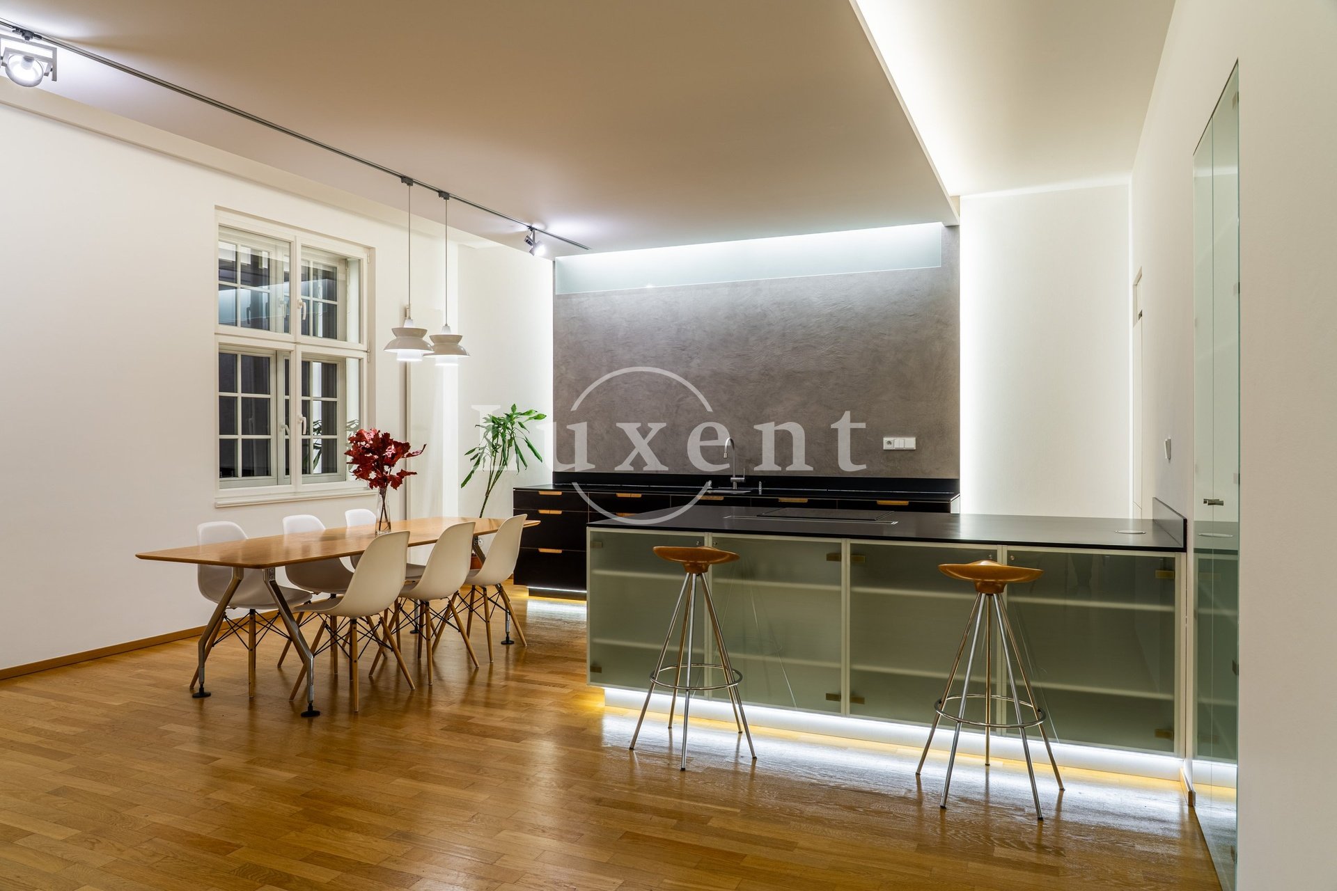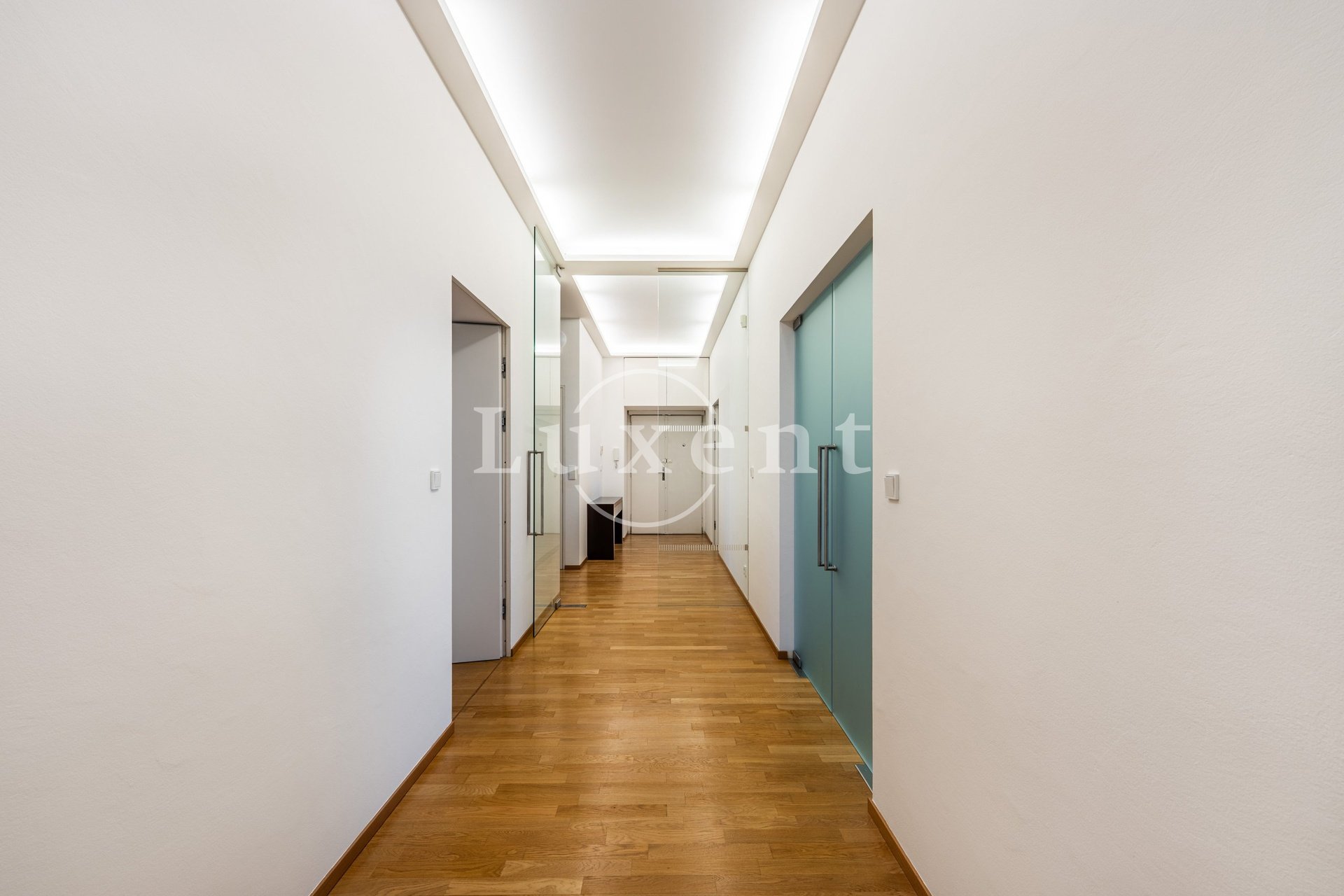 We are offering for sale a spacious modern apartment measuring 126 m² with a generous 3+kk layout, a balcony, two luxurious bathrooms, and a large cellar on the 1st floor (+17 m²) on Letohradská Street in Letná, Prague 7. The apartment has undergone a high-quality complete design renovation, including modifications to the layout. The property is partially furnished, has high ceilings and a southern orientation towards Letná Park, with a quiet north-facing master bedroom with a balcony overlooking the green courtyard. The building has been renovated and there is a new elevator.