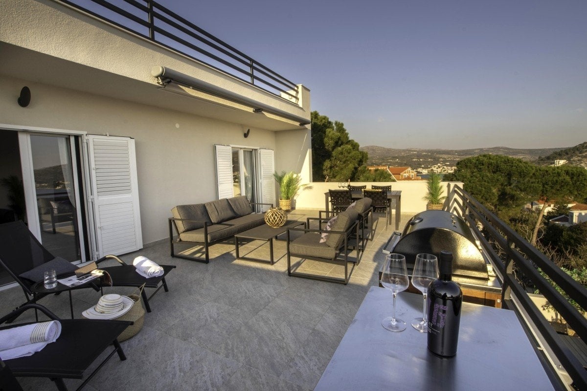 The 51 m² interior includes a living room connected to the kitchen and dining room, two bedrooms, and two bathrooms. The space is bright and practically arranged, with large glass surfaces connecting the interior to a spacious terrace. The 31 m² terrace offers unobstructed views of the sea and the surrounding area, creating a unique atmosphere and adding value to the property.