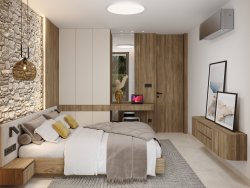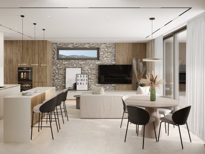 The apartment is sold fully furnished and ready to move in. It is equipped with high-quality furniture, ceramic floors, and a combination of tiles, stone, and wood on the terraces. The bathrooms and toilets are fitted with first-class sanitary ware, complemented by modern lighting, security entrance doors, and interior doors with magnetic locks. Comfort is also ensured by carpets, curtains, zip screen blinds, sofas, beds, a dining table with chairs, and a fully equipped kitchen with AEG appliances, including a washing machine. The above-standard equipment is complemented by a stylish wine cellar.