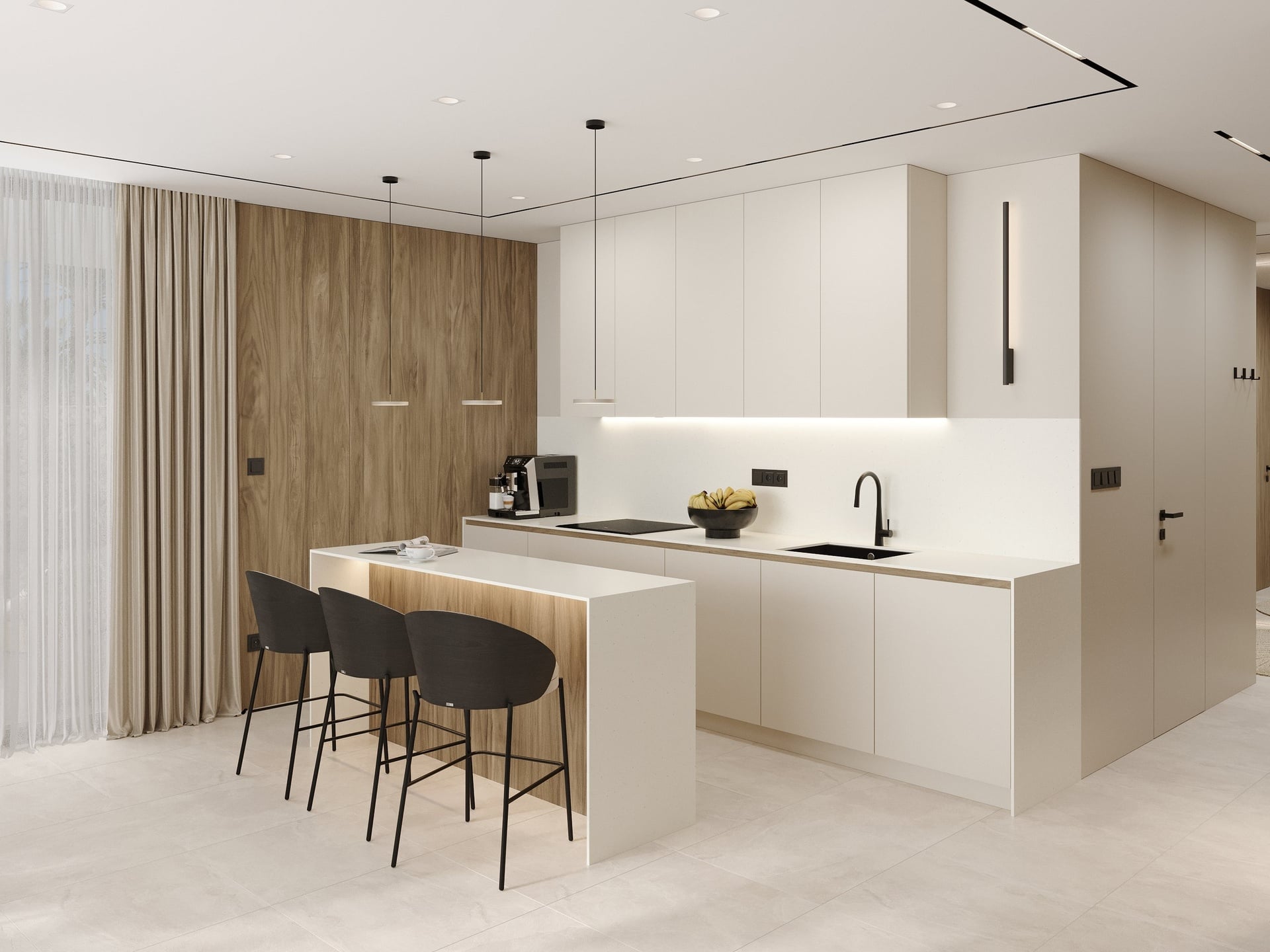 For maximum comfort, the apartment is air-conditioned with a Daikin Emura system with additional electric underfloor heating in the bathrooms. Large-format Reynaers aluminum sliding doors provide unobstructed sea views, while Renson sun blinds and elegant glass railings on the terraces emphasize the modern design and functionality.