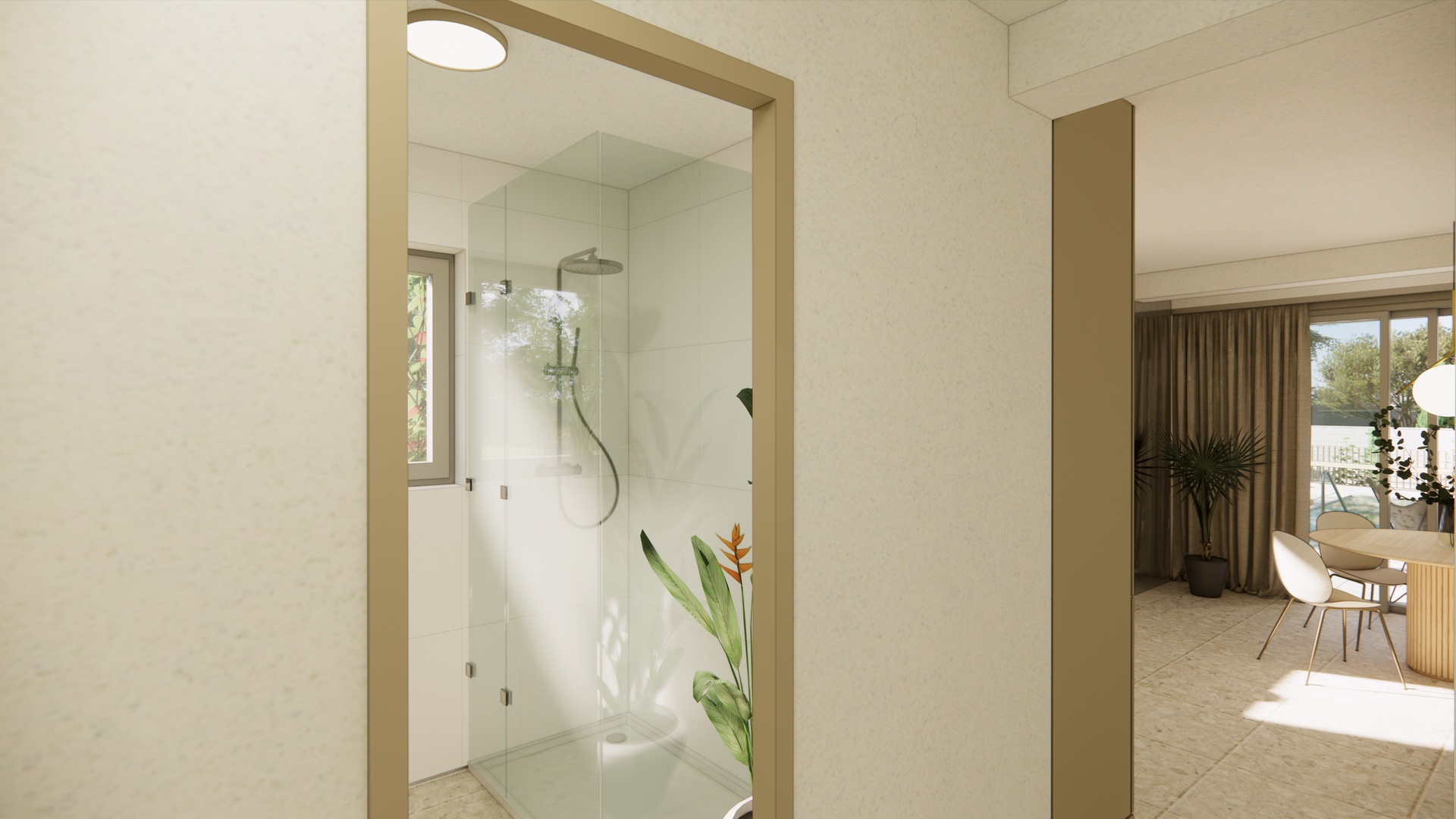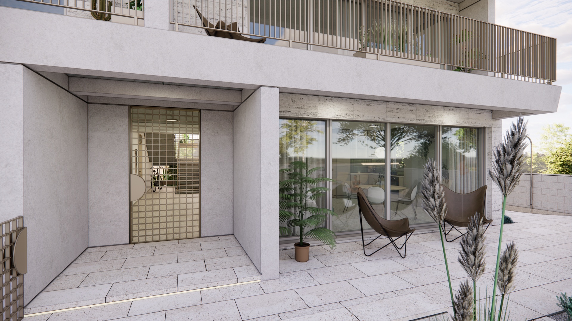 The apartment with a total area of 80.8 m² is thoughtfully designed and offers two bedrooms, two bathrooms and an open living area with kitchen and dining room. From the living area there is direct access to the terrace of 13.8 m², which provides a pleasant privacy and space for relaxing in the open air.