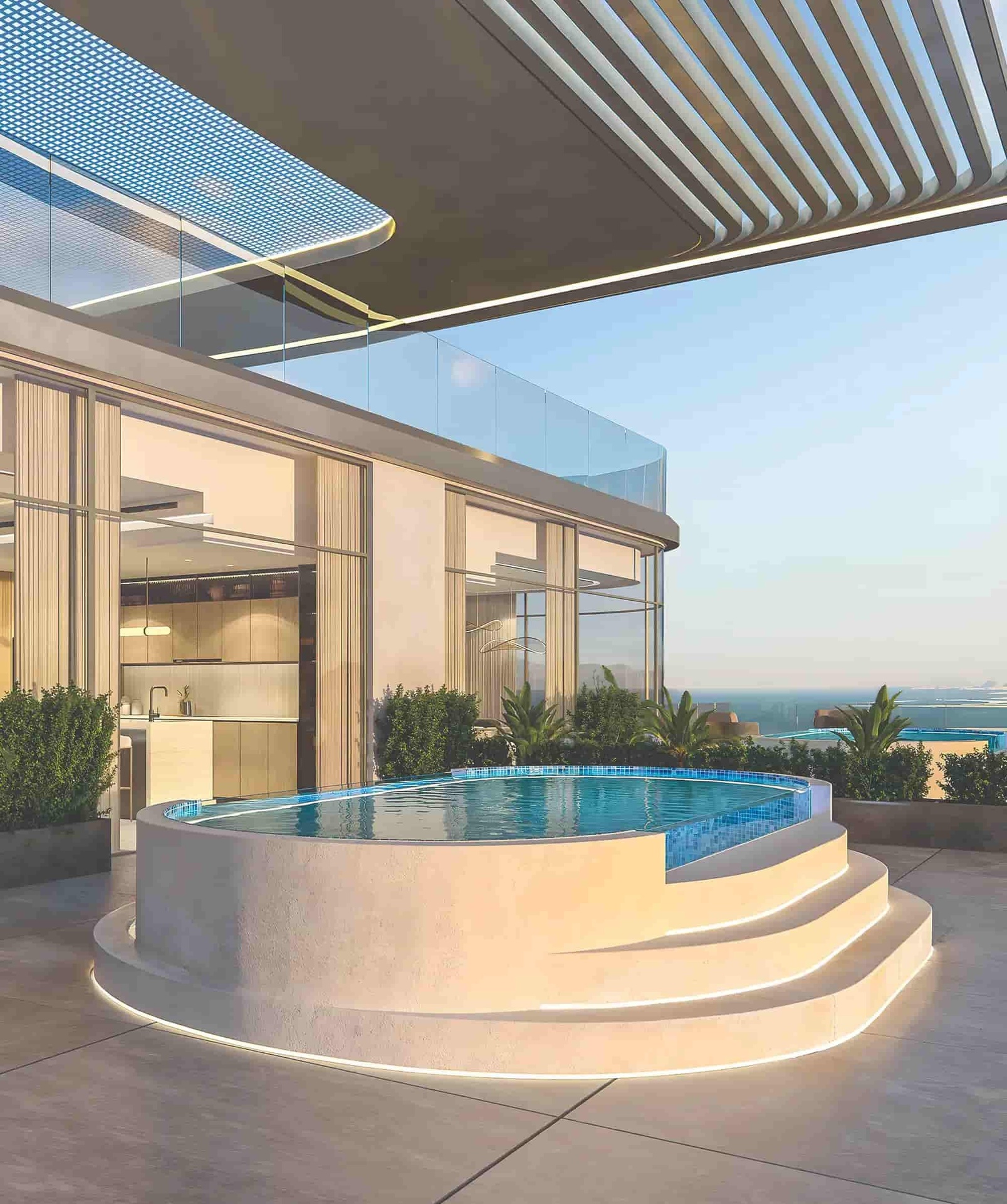 Arka Enclave Residences is designed as a harmonious combination of resort lifestyle and urban elegance. Residents have direct access to the beach, peaceful gardens, and relaxation areas that create space for rest and relaxation. The project includes a modern fitness center and carefully designed common areas that promote an active and balanced lifestyle. The natural highlight of the residence is the rooftop pool with a lounge area, offering unobstructed panoramic views of the surrounding islands and coastline—the ideal place to relax in the evening as the sun sets. Selected residences in the project also have private pools, which underlines the exclusivity of the entire concept.
