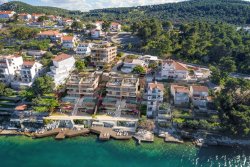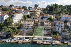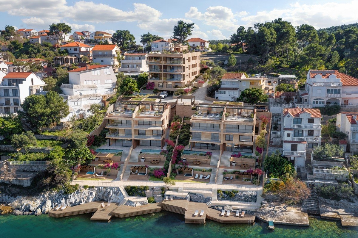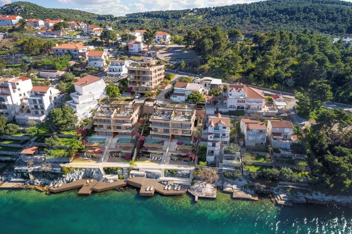 We are offering for sale a luxury apartment with a garden and private pool in Okrug Donji. The 132.46 m² apartment on a 293.63 m² plot is located in the first row by the sea and offers direct access to a landscaped sun terrace with views to the north, south, and east.