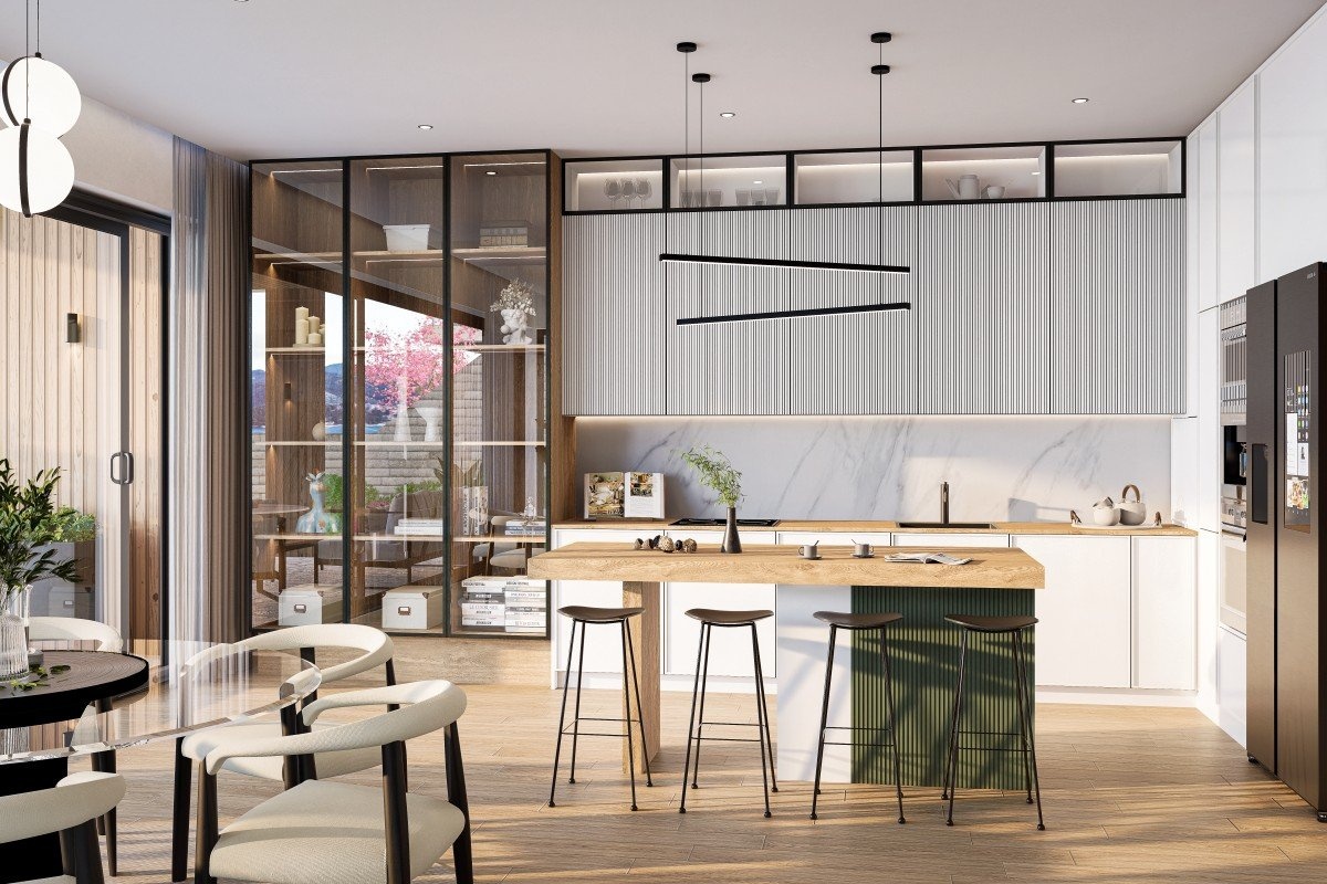 The apartment is spread over two floors connected by an internal staircase and elevator. The upper floor consists of three bedrooms, two of which have their own balcony, two bathrooms, a hallway, and a laundry room. The lower floor is designed as an open living space, where the dining room, kitchen, and living room connect to the terrace and garden. There is also a guest toilet.