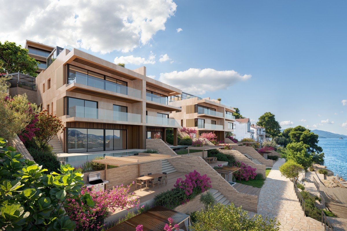 The outdoor space is designed in a cascading style – terraces with gardens, a private pool, and relaxation areas ensure maximum privacy and a feeling of having your own home, even though the apartment is located in a smaller residential building with four units. There are also common areas, including a rooftop terrace with sun loungers and sea views, a fitness center, a sauna in the basement, and another pool. One covered parking space is included, with the option to purchase a garage.