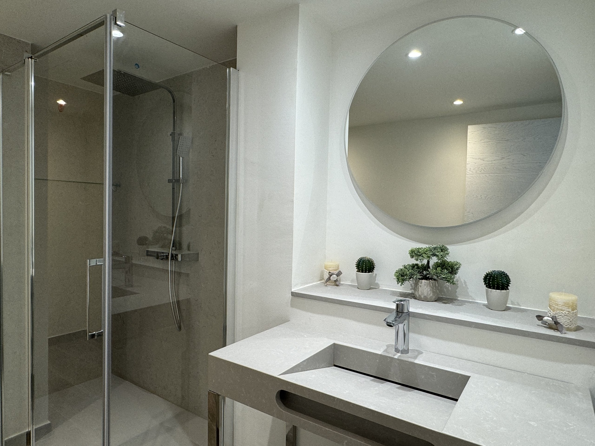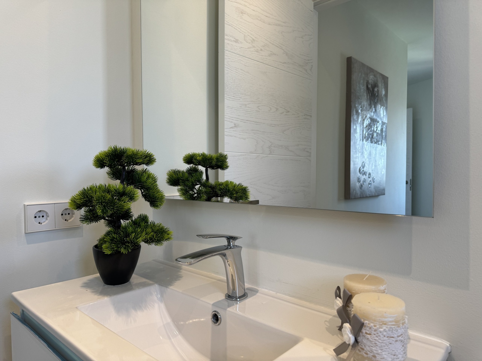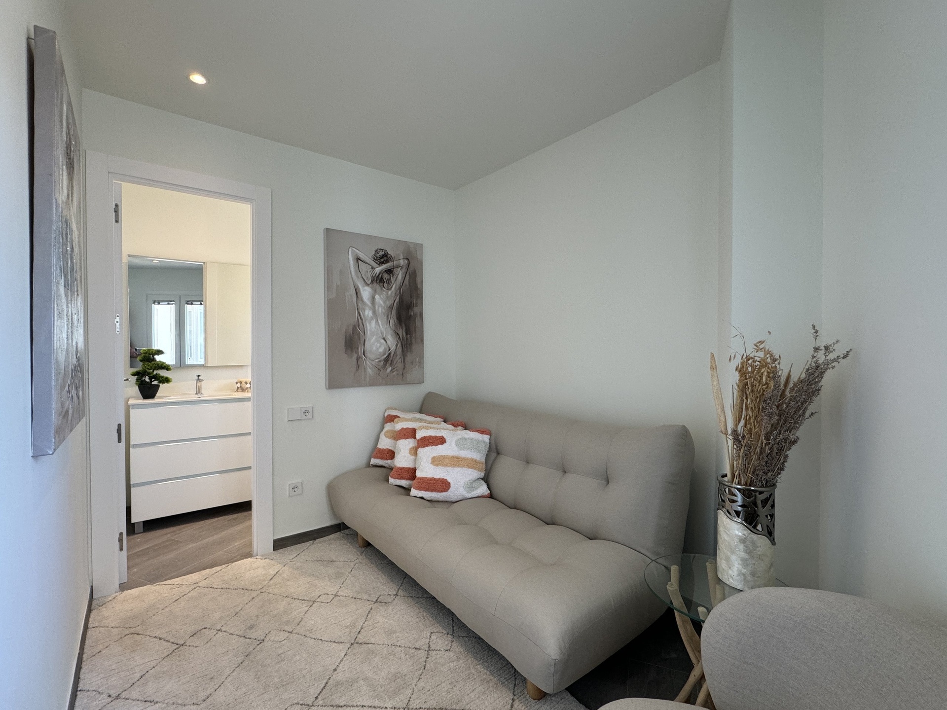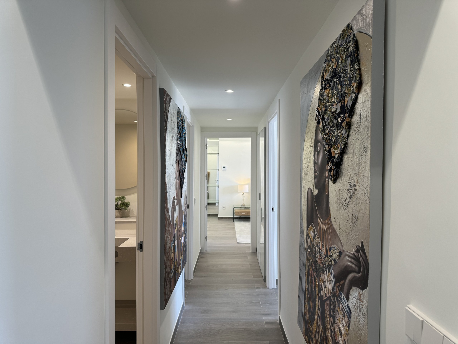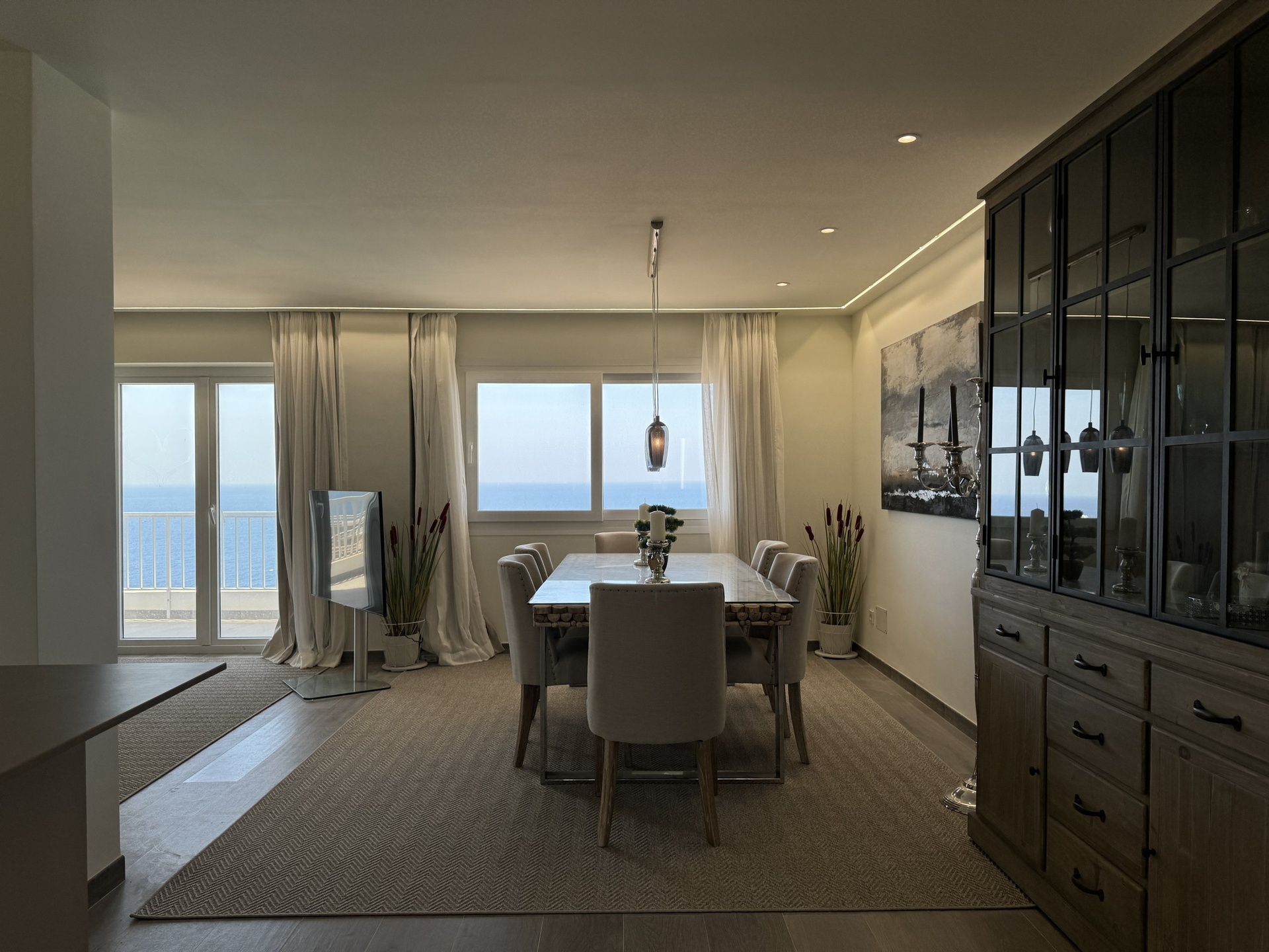 The apartment with a total usable area of 160 sqm offers a spacious living room connected to the dining room, a modern equipped kitchen with pantry and utility room, a small study and master bedroom with en-suite bathroom, two additional bedrooms, a second bathroom and a separate guest toilet. From the covered balcony of about 15 sqm you can admire every day the sunny views of the beach of Cala Major and the turquoise sea of the Balearic Islands. The apartment also includes a private parking space in the underground garage with lift, ensuring maximum comfort for your stay.
