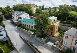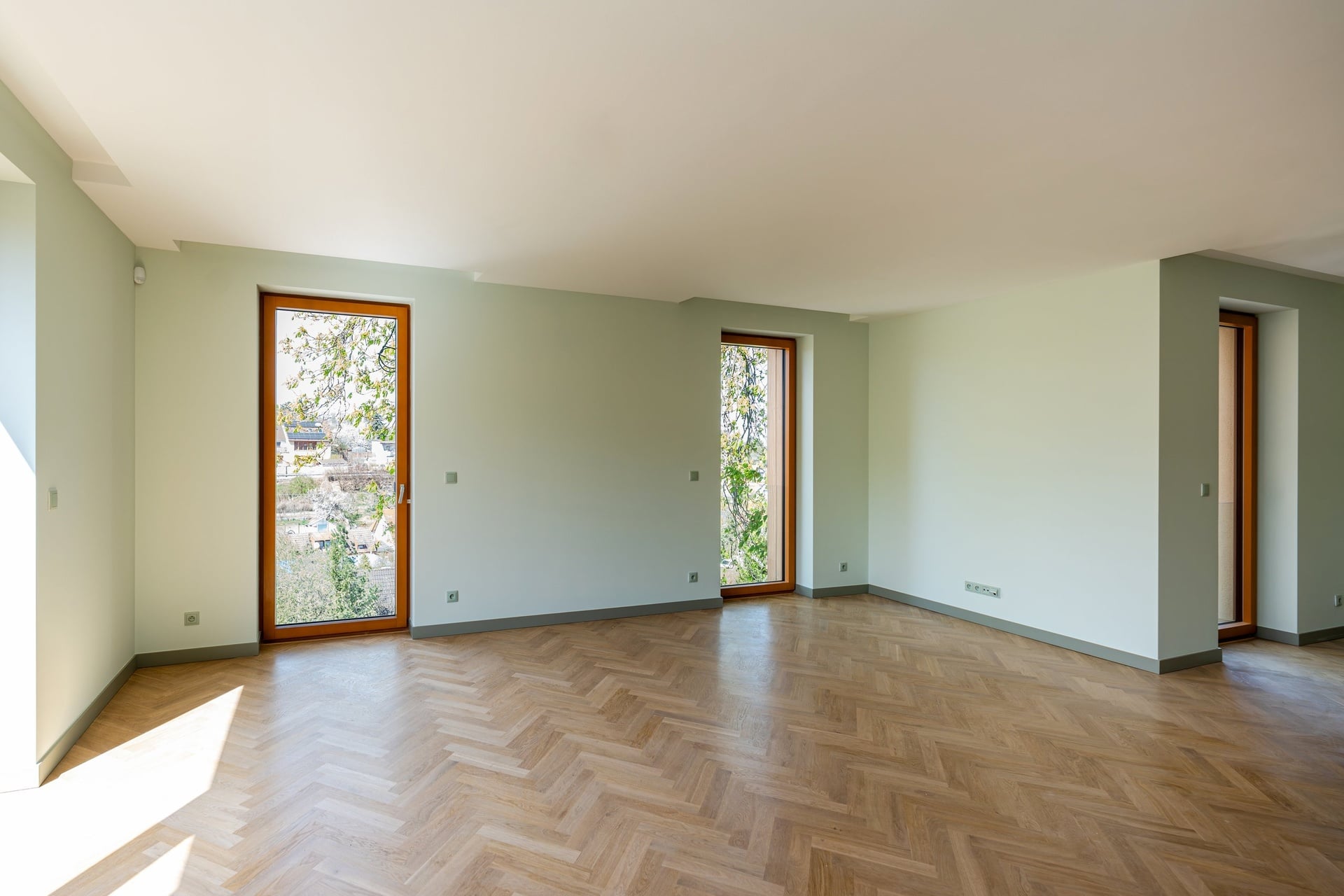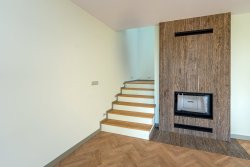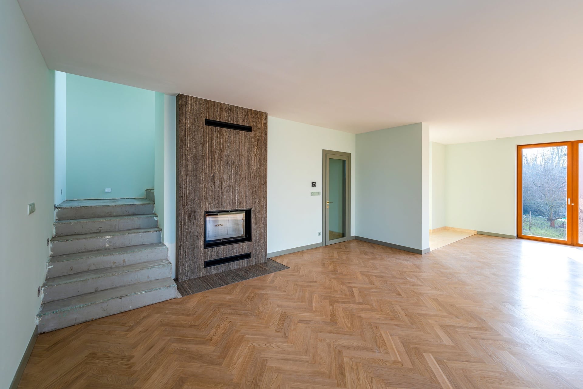 The residence is finished to a high standard – Porotherm 50, façade covered with Brazilian ash Garapa, wooden windows with insulated triple glazing, standing seam metal roof, three-layer wooden flooring, marble floors, underfloor heating, security and camera system by Jablotron, preparation for external blinds. Heating is provided by a STIEBEL ELTRON air-to-water heat pump.