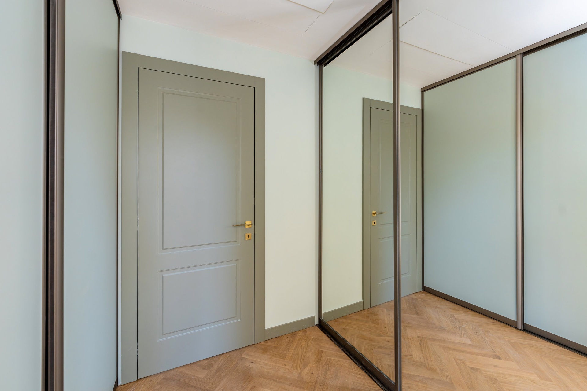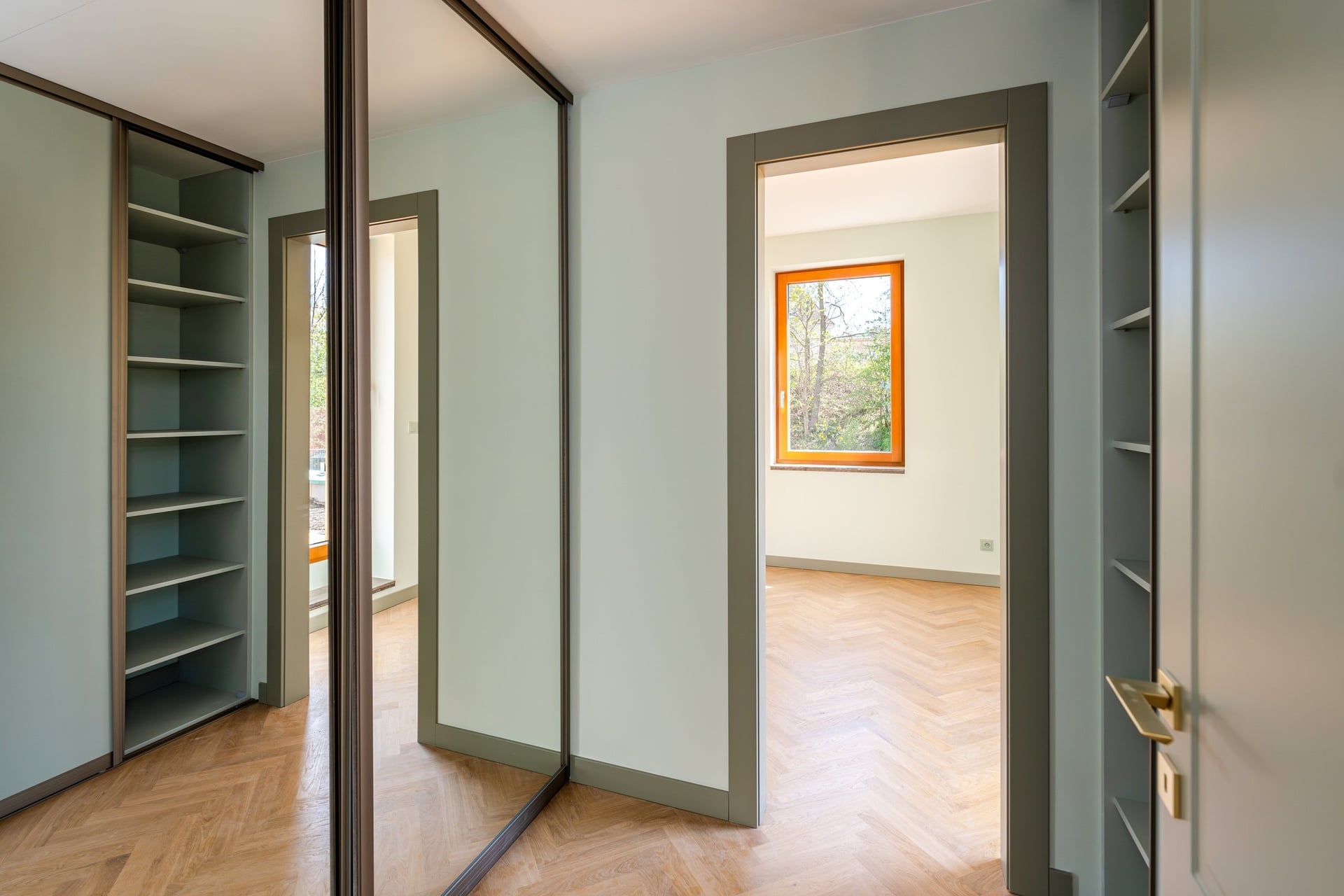 The interior of the first floor is creatively divided into two sections – the living area and the private section. The bright entrance hall with space for built-in wardrobes leads to the kitchen and the generous living room with a fireplace (58 m²), or to the hallway with a technical room, separate toilet, and entrance to the bedroom (18 m²) with a bathroom (3.80 m²). The living room and kitchen offer a fantastic view and an unparalleled atmosphere.