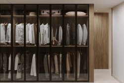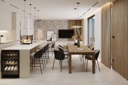 The penthouse offers a total area of 257.47 m² – interior 141.57 m², covered terraces 49.90 m² and open terrace 66.00 m². The price also includes two garage parking spaces and a 16.20 m² cellar. The apartment is sold fully equipped and furnished – from custom-made furniture, a kitchen with AEG appliances and a wine cooler to luxurious bathrooms, designer lighting, carpets, curtains, and modern blinds.