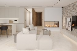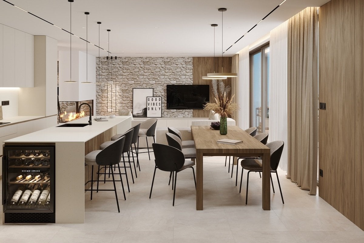 The high standard includes underfloor heating throughout the apartment, Daikin Emura air conditioning, Reynaers aluminum sliding windows, electric zip screens, and glass railings on the terraces. For an additional fee, it is also possible to add the Panorama Rooftop Lounge & Bar with a bar, pergola, and seating area according to your own ideas.