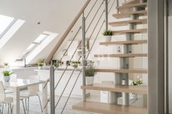 The apartment is entered through an entrance hall into a spacious living room with a kitchen and dining area (79 m²). From here, a modern staircase leads to the upper terrace with a view of Prague Castle and Petřín.