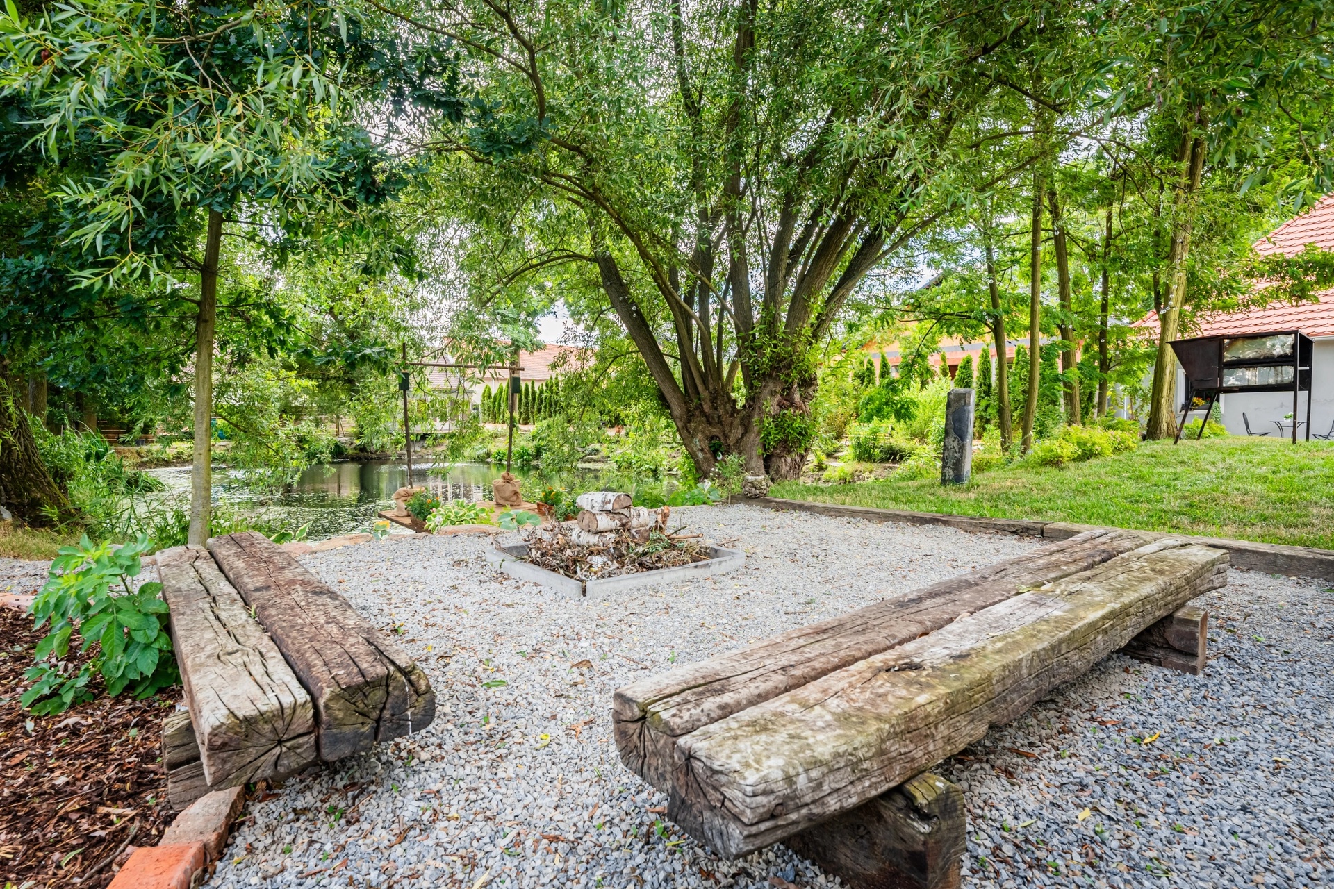 The estate is majestically enclosed by a massive stone wall, providing privacy and exclusivity. The entrance to the castle courtyard is guarded by an impressive automatic metal gate. The front part of the property features an elegant formal garden. By the castle barn, there is a ceramic pool with automation and a counter-current system. The courtyard surrounded by buildings with a central steel sculpture seamlessly transitions into an intimate park surrounding the stocked pond, lined with mature trees, with a pier and stylish seating by a fire pit with a grill.