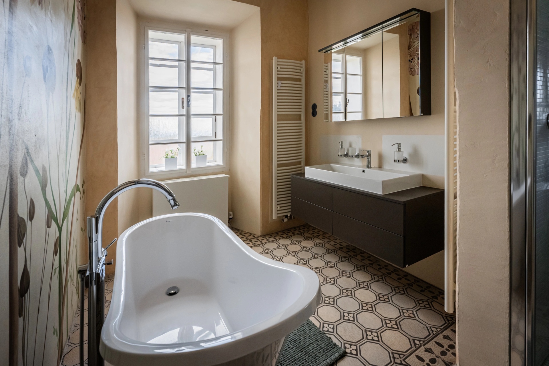 A Renaissance staircase leads from the ground floor hall to the upper floor with a spacious central hall dividing the building into two wings. In each wing are luxury bedroom suites with private bathrooms equipped with premium fittings by Villeroy & Boch. The master bedroom has two spacious walk-in closets (separate men's and women's). The floors of the second floor, covering 180 m², are original refurbished oiled solid wooden planks.