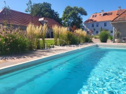 The former castle carriage house now serves as a spacious garage for four cars. Opposite it is the castle stable, converted into two separate boutique guest apartments, each with its own bathroom. There is also a separate toilet with a shower for visitors to the outdoor areas.