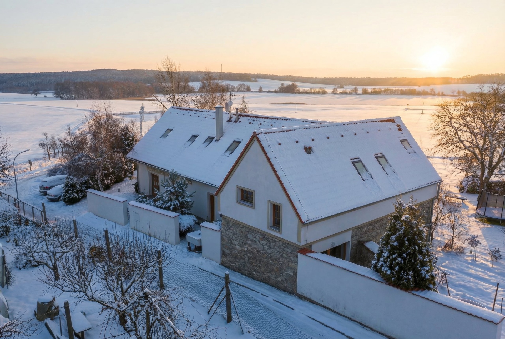 The house is low-cost and equipped with modern technologies, built of bricks and insulated. The heating source is a MasterTherm water-air heat pump with remote control. The entire house has floating heated floors. Two chimneys allow for three fireplace locations. The Euro windows are wooden with vacuum double glazing. The security system can be connected to a security company and has motion and fire sensors. There is LED lighting around the house. The drinking water is municipal, high quality, and low cost. The house is connected to the municipal sewer system. The property includes a cultivated garden with mature trees and a children's playground. There is also a utility well and electrical wiring and other utilities for versatile use throughout the property.